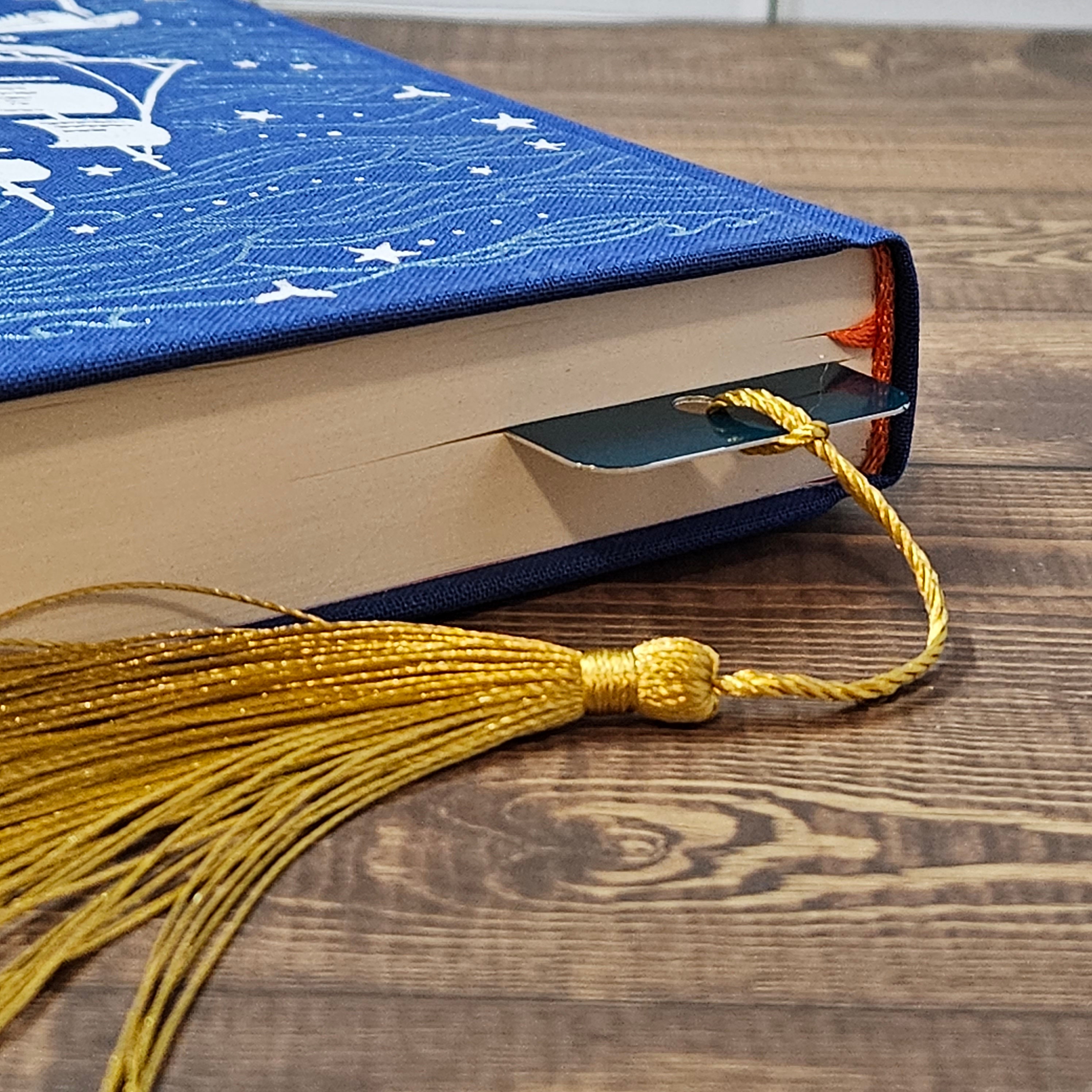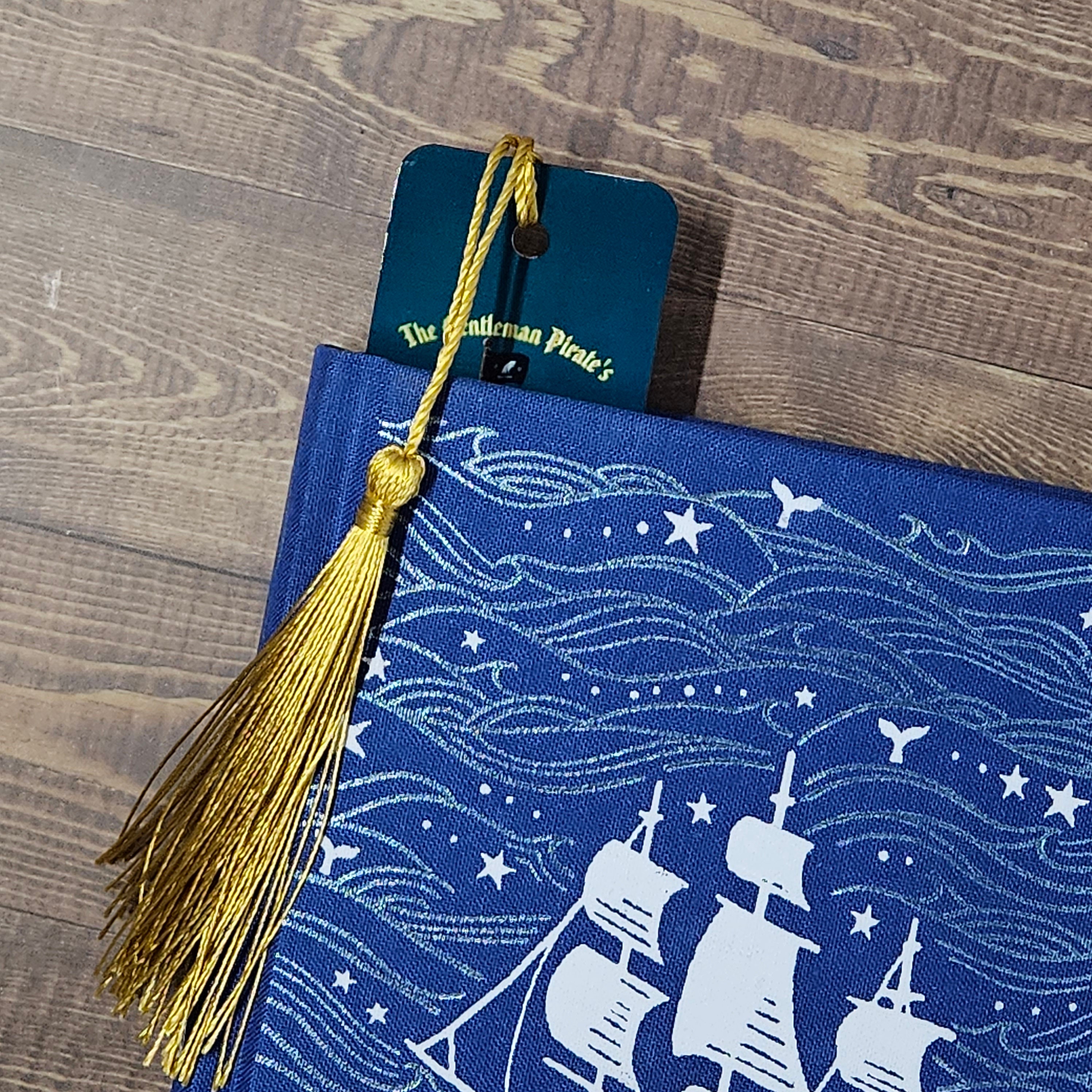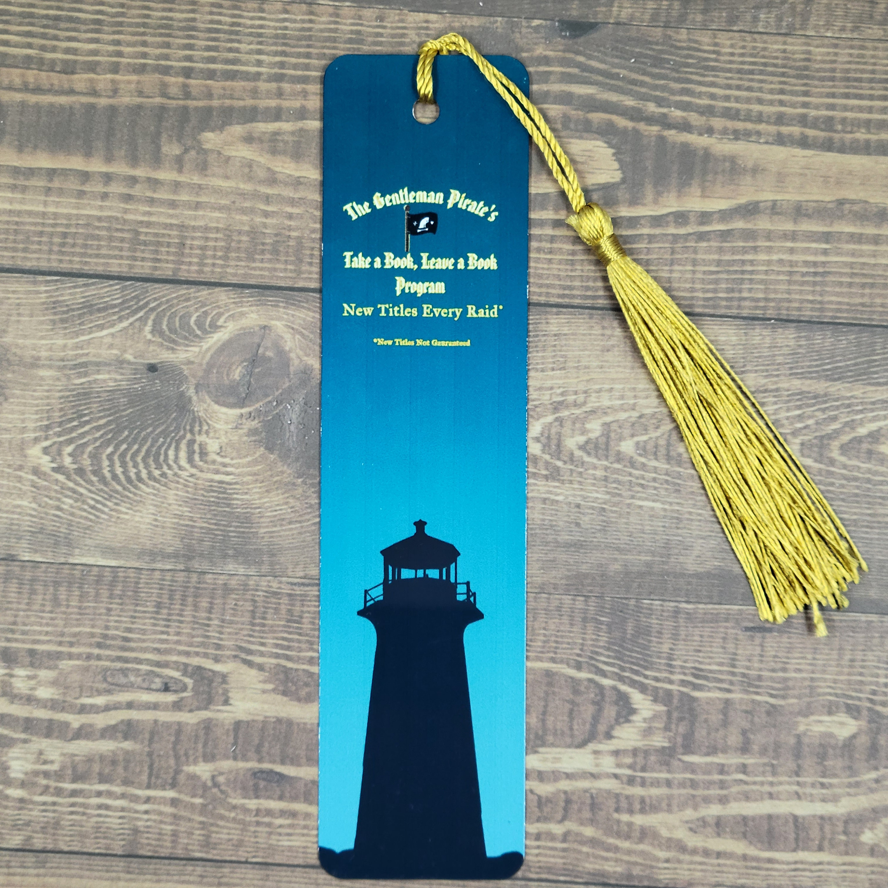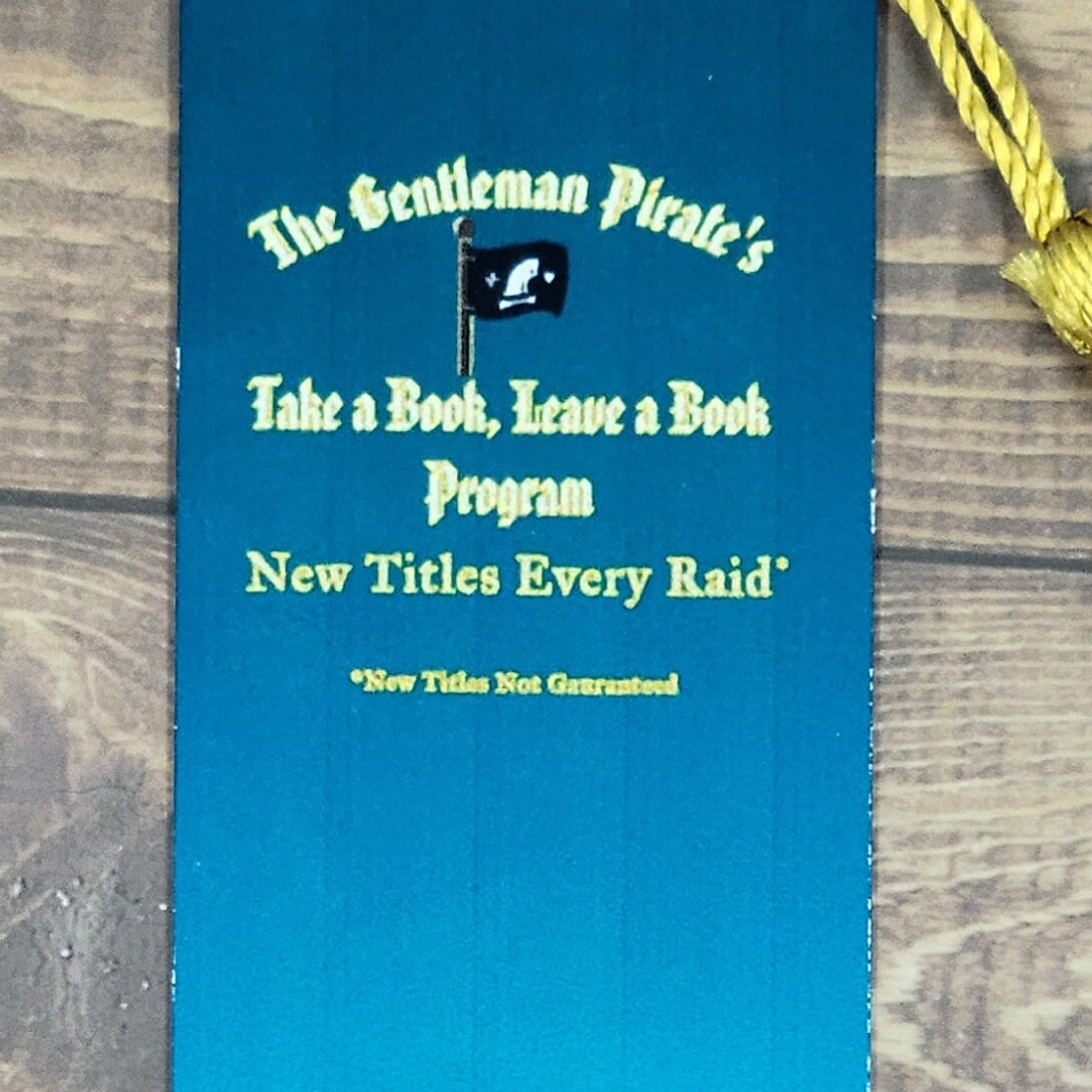 A 1.25" x 6" aluminum bookmark featuring Stede's Take a book, leave a book approach to raiding. Gold polyester tassel attached.