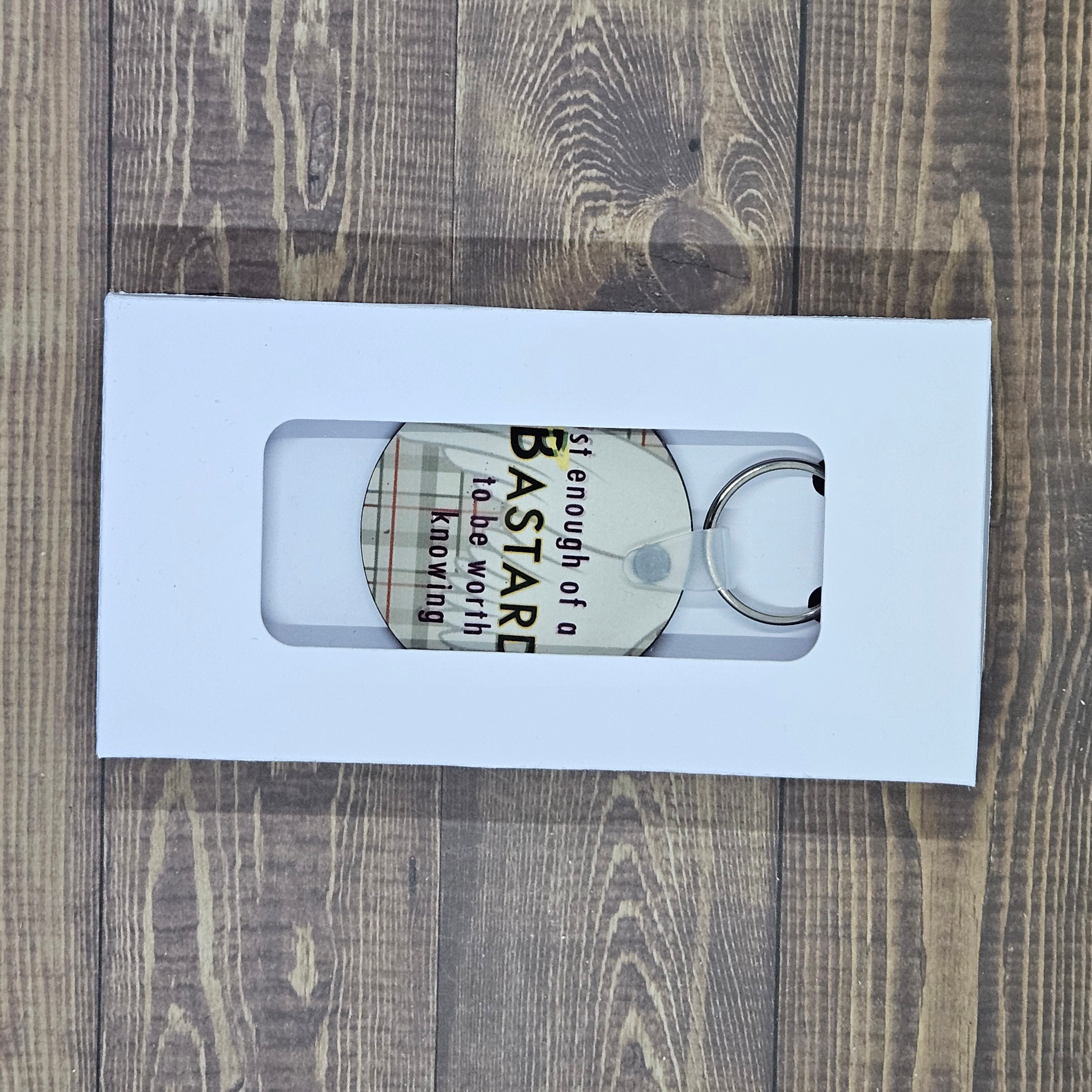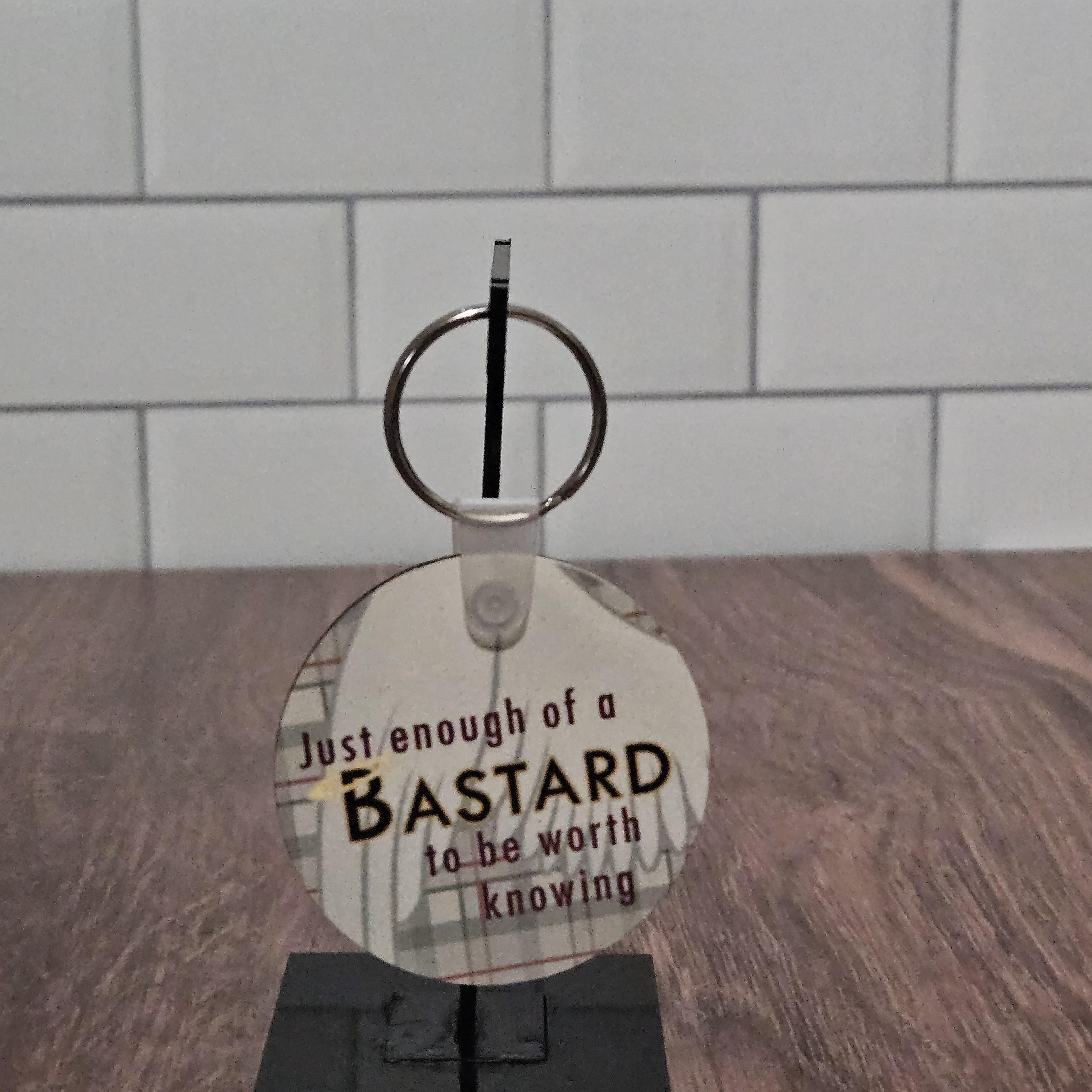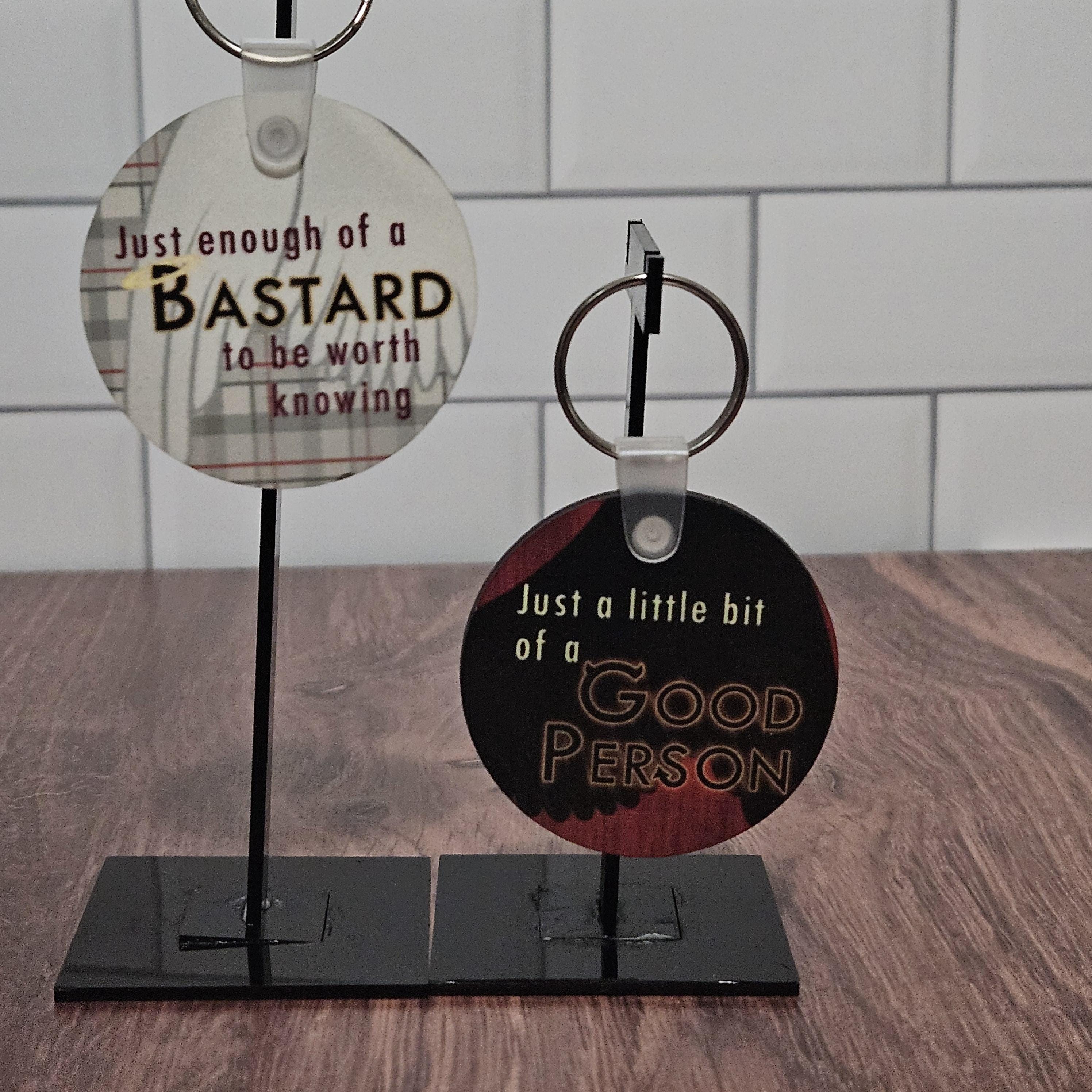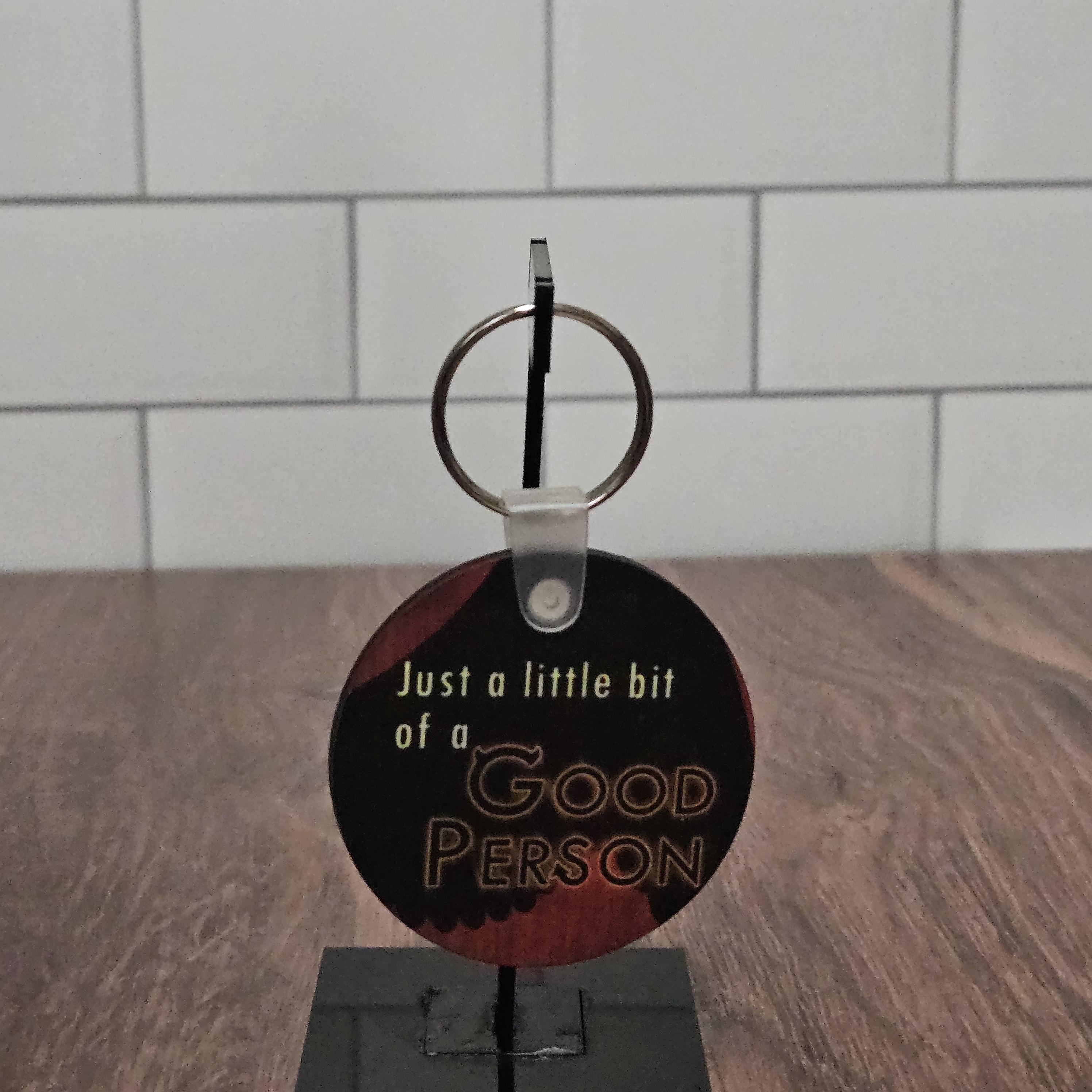 Double-sided keychain featuring part of the quote Crowley and Aziraphale said to each other over champagne at the Ritz. 2" Diameter, plastic shell with and MDF core.