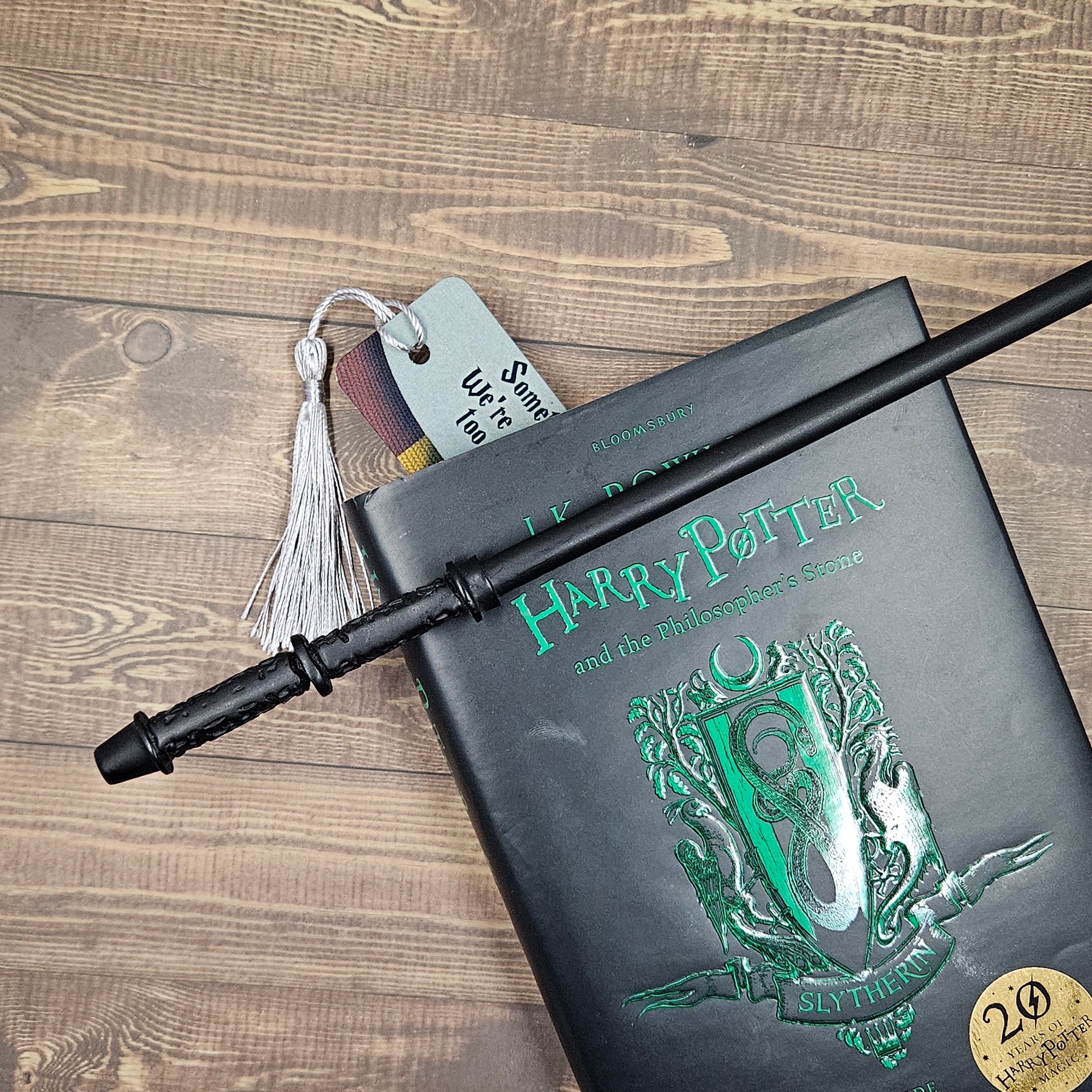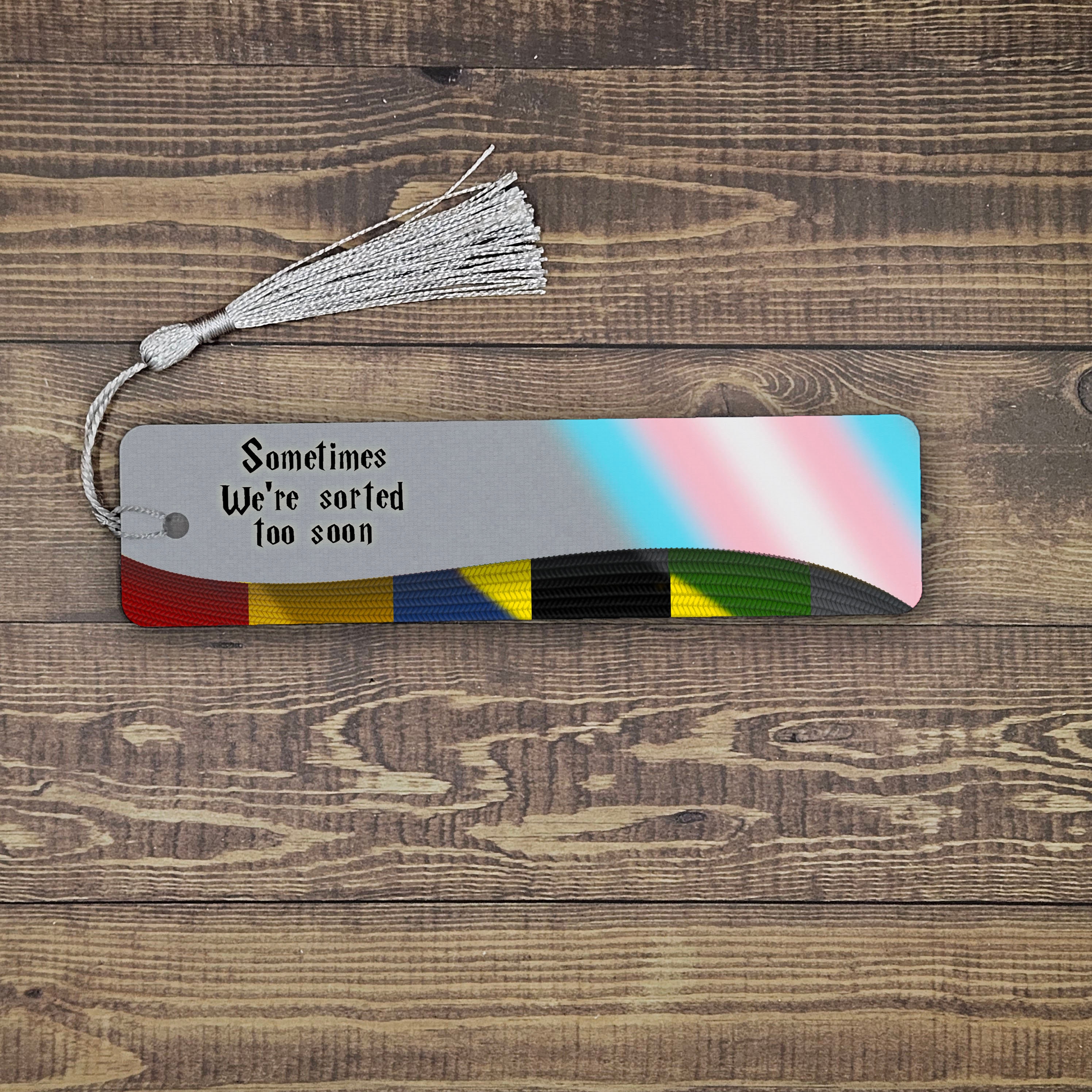 Reclaim the fandom! This bookmark features a twisted quote from the series, all the colors of the houses, and a lighting effect of the pride flag.