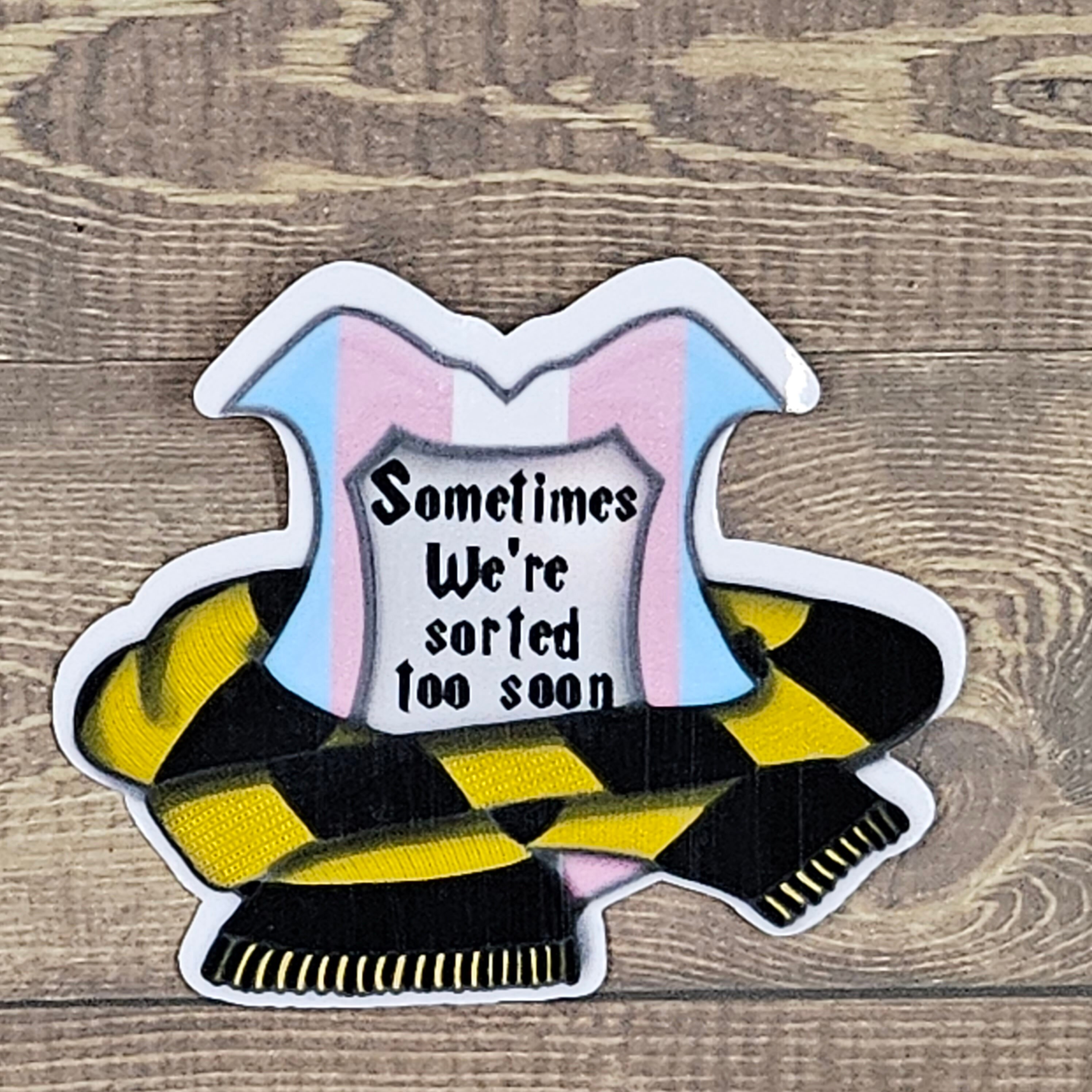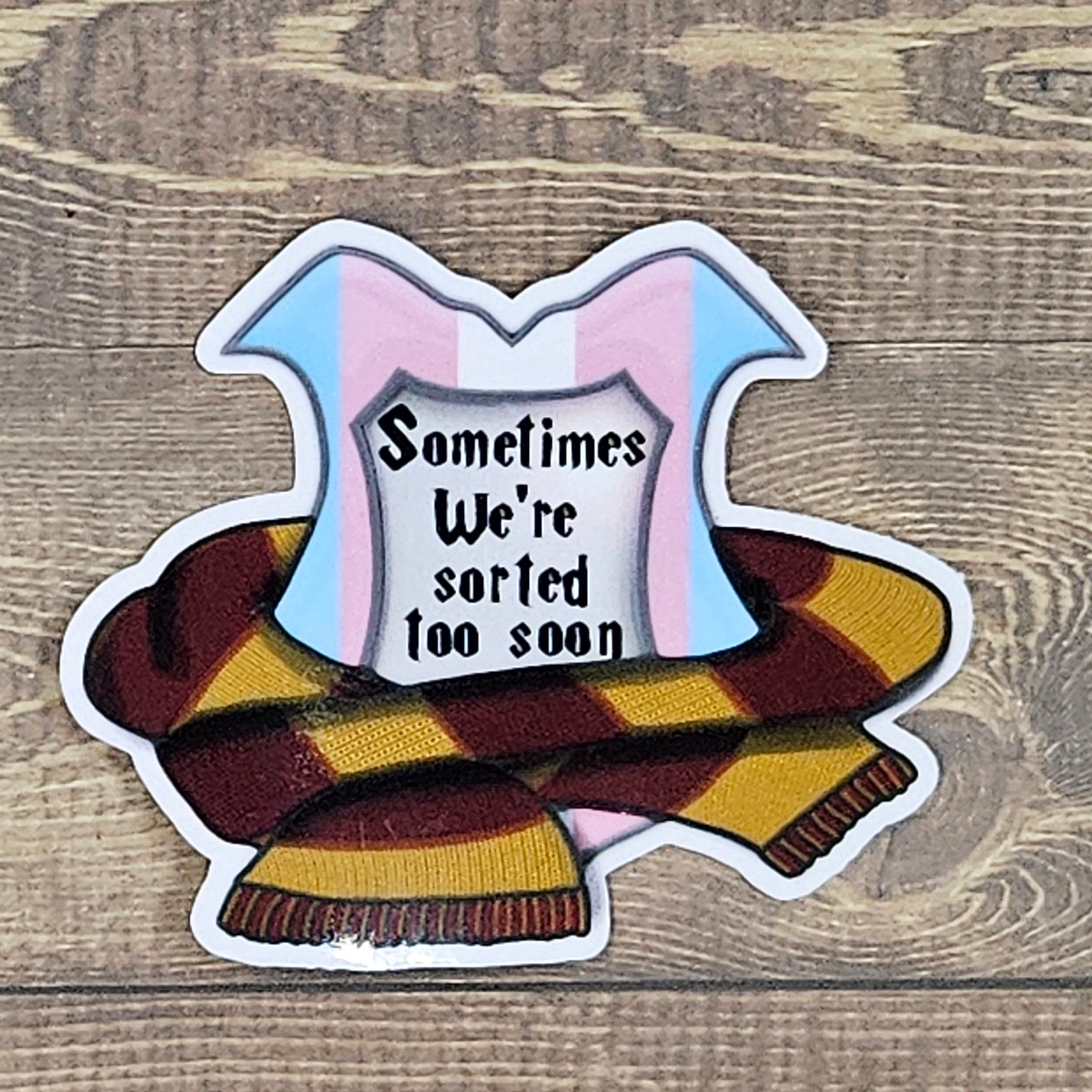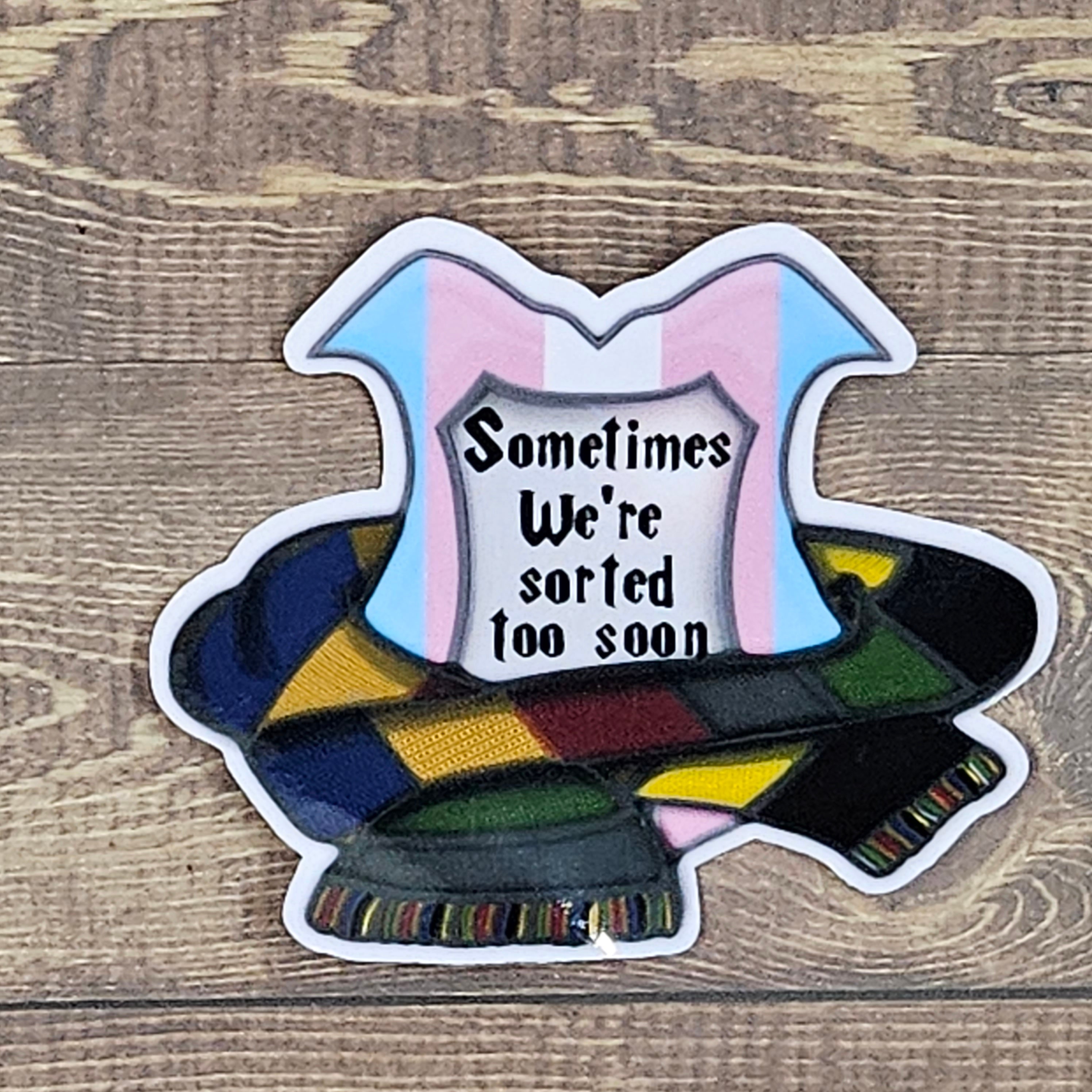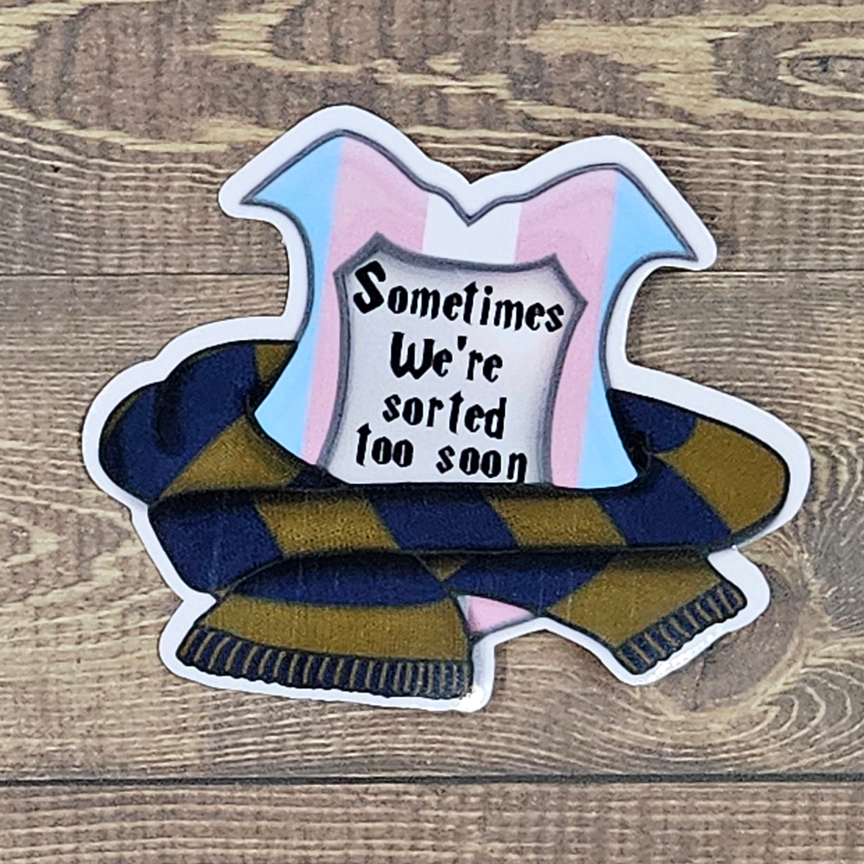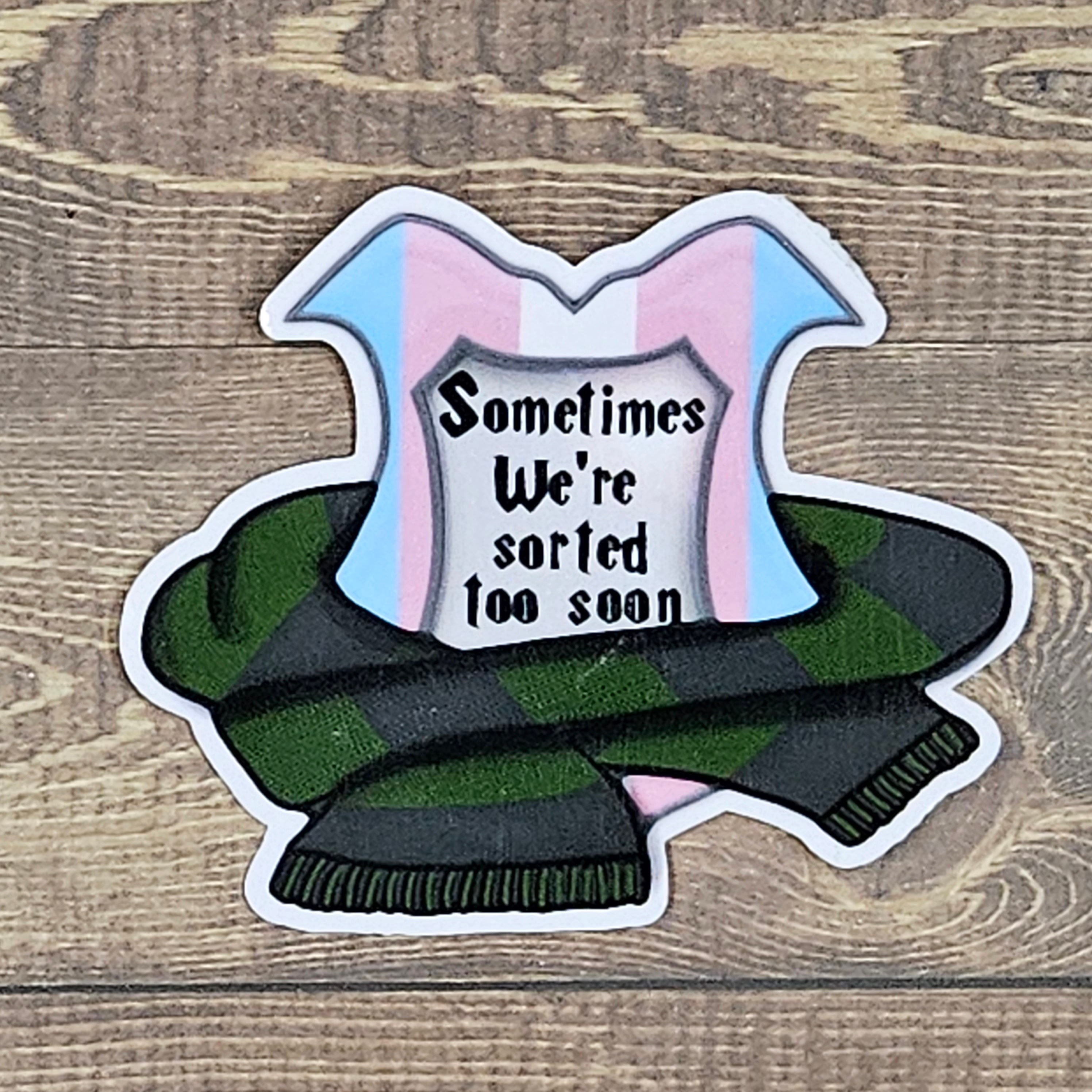 A pride sticker with your choice of scarf! Featuring the Trans Pride flag taking over the Hogwarts Crest.