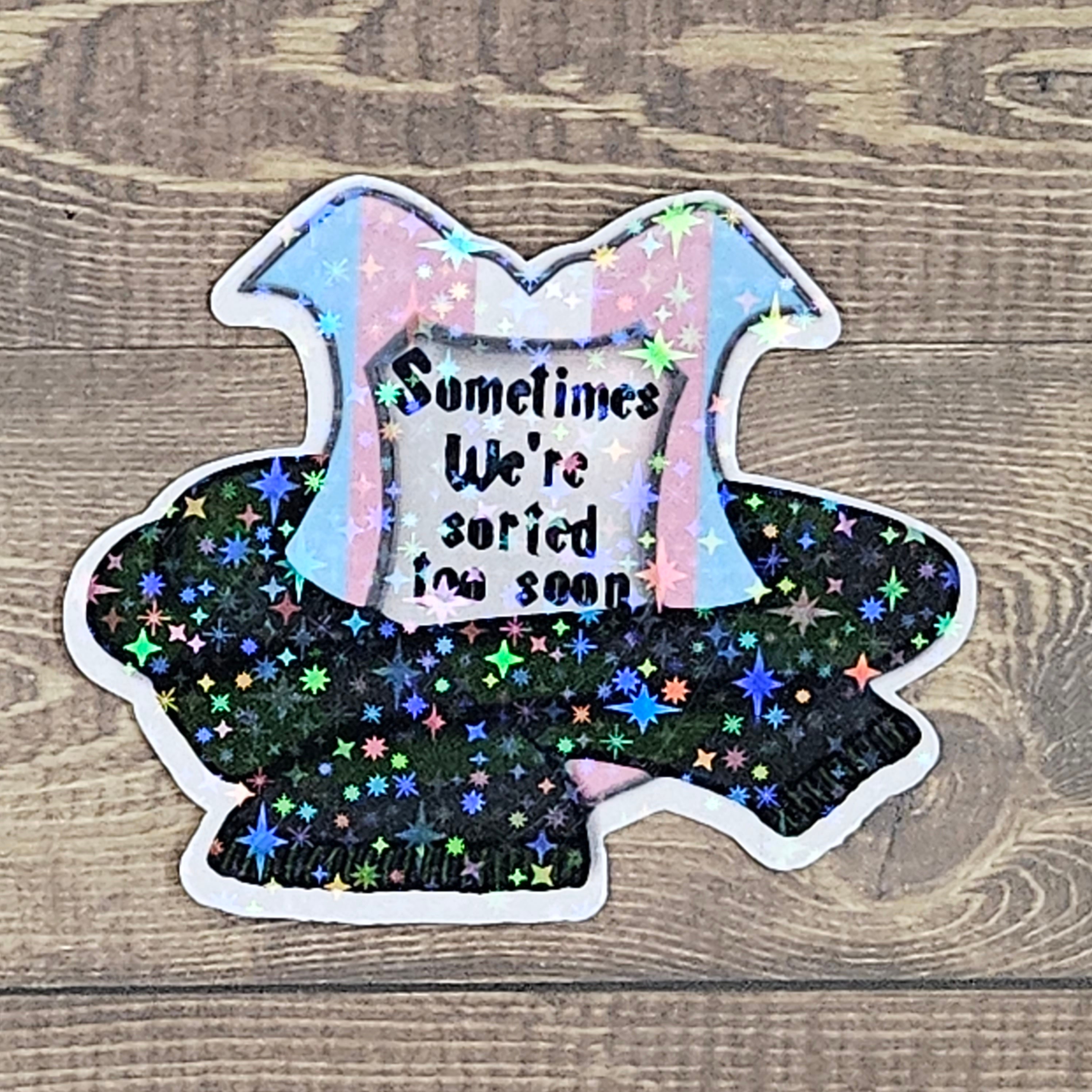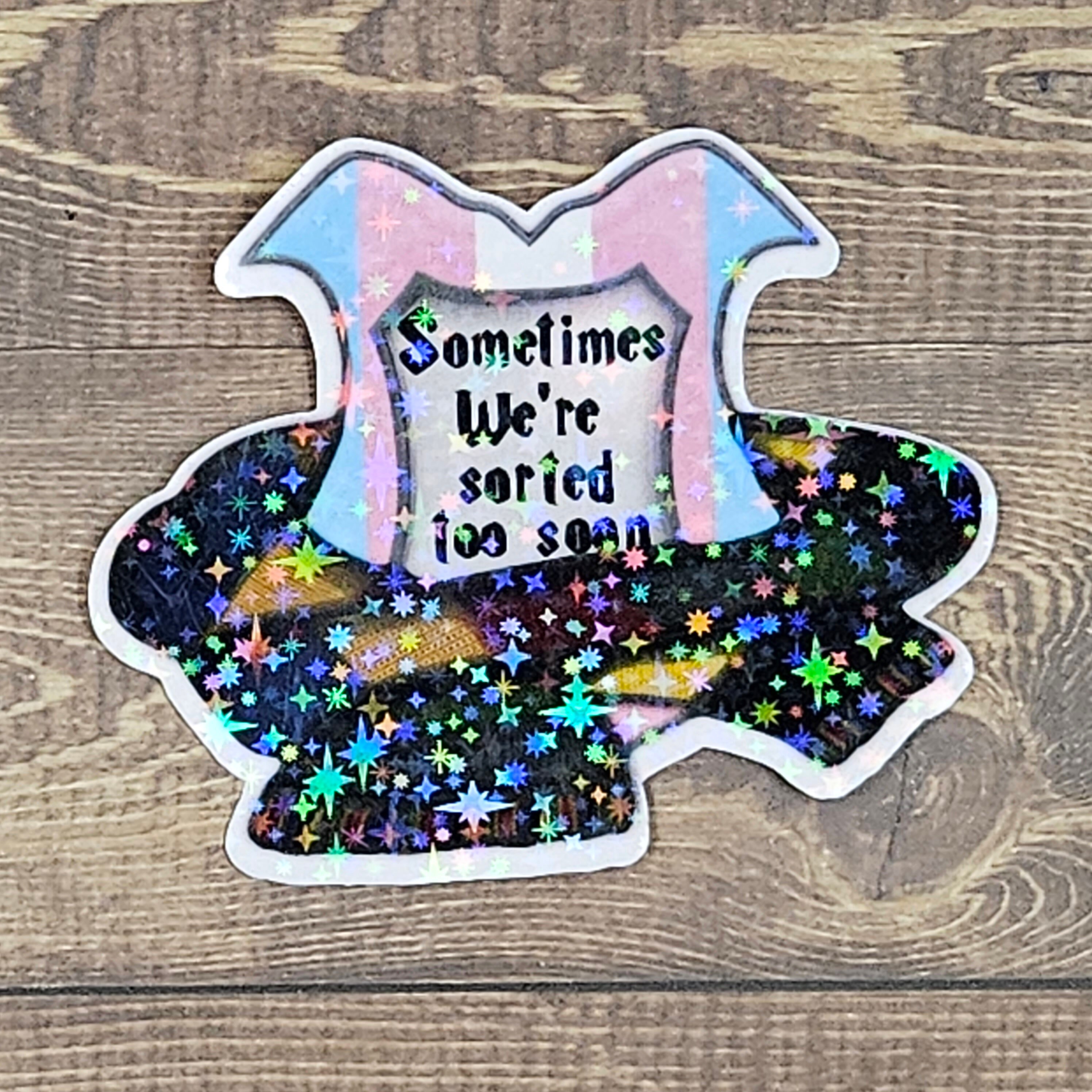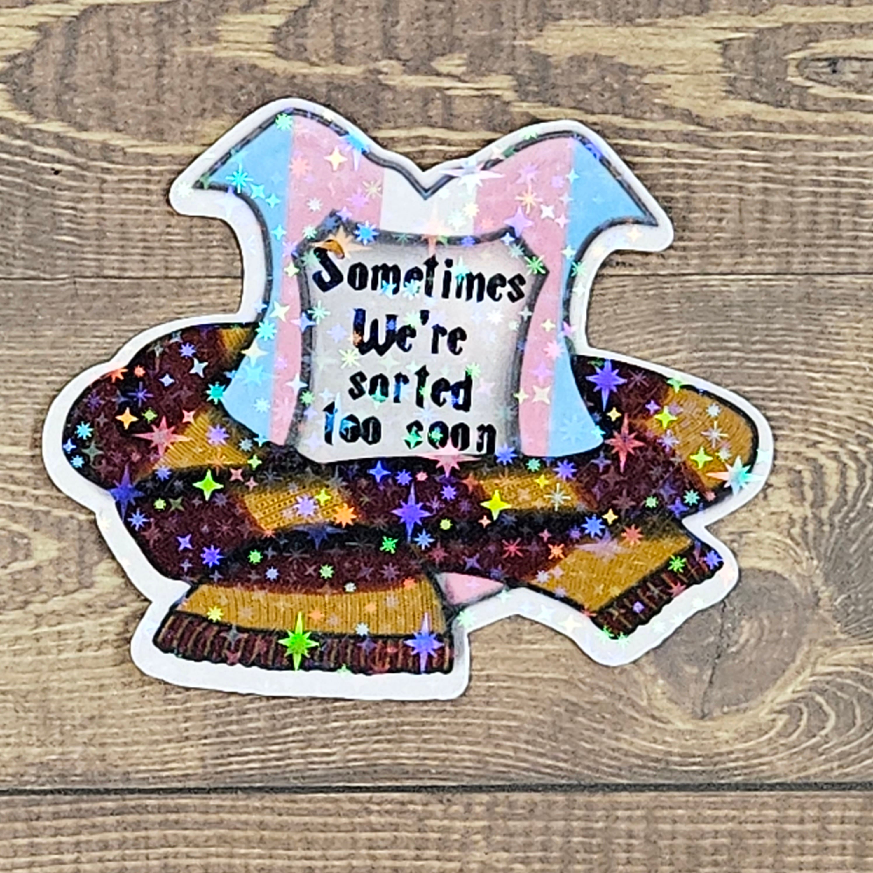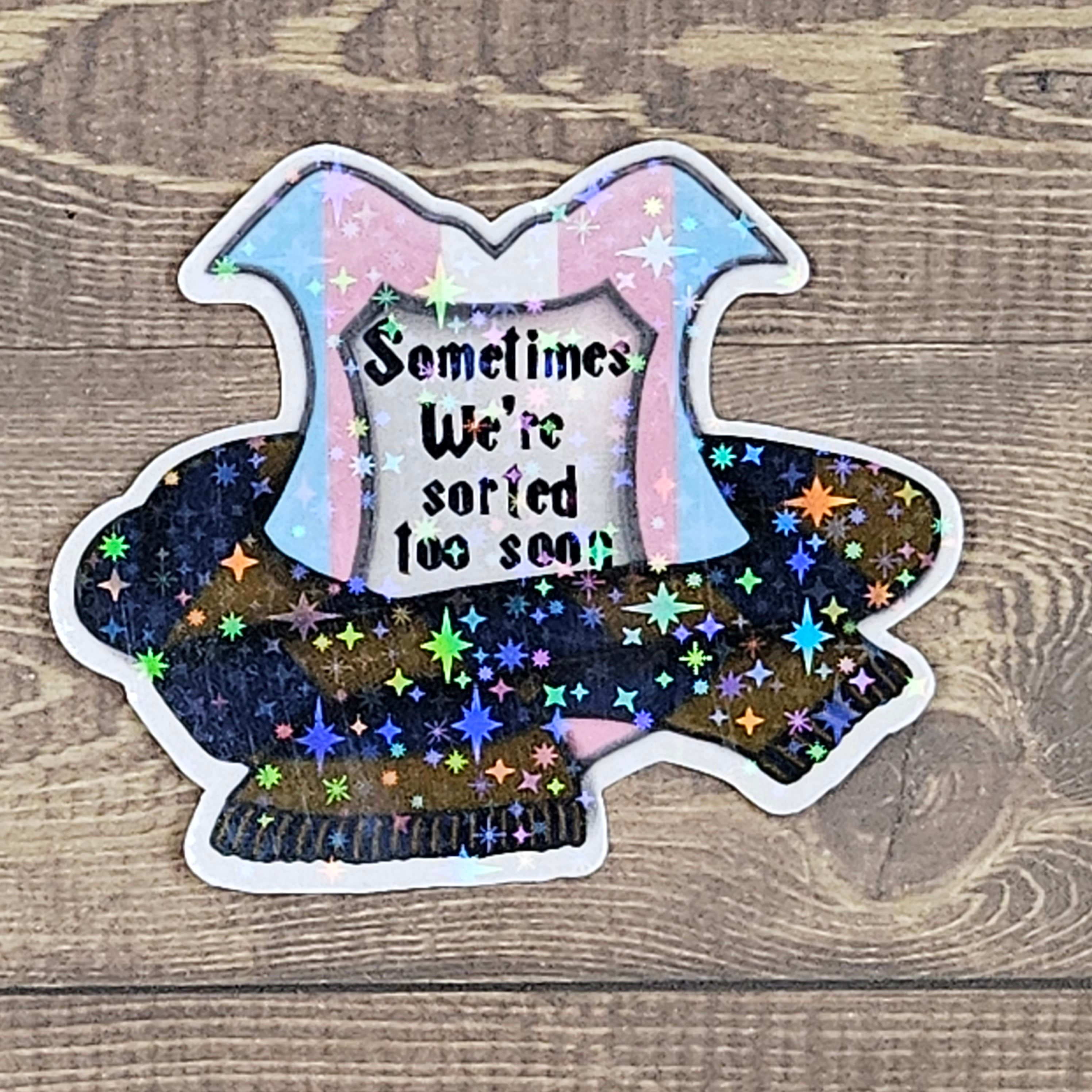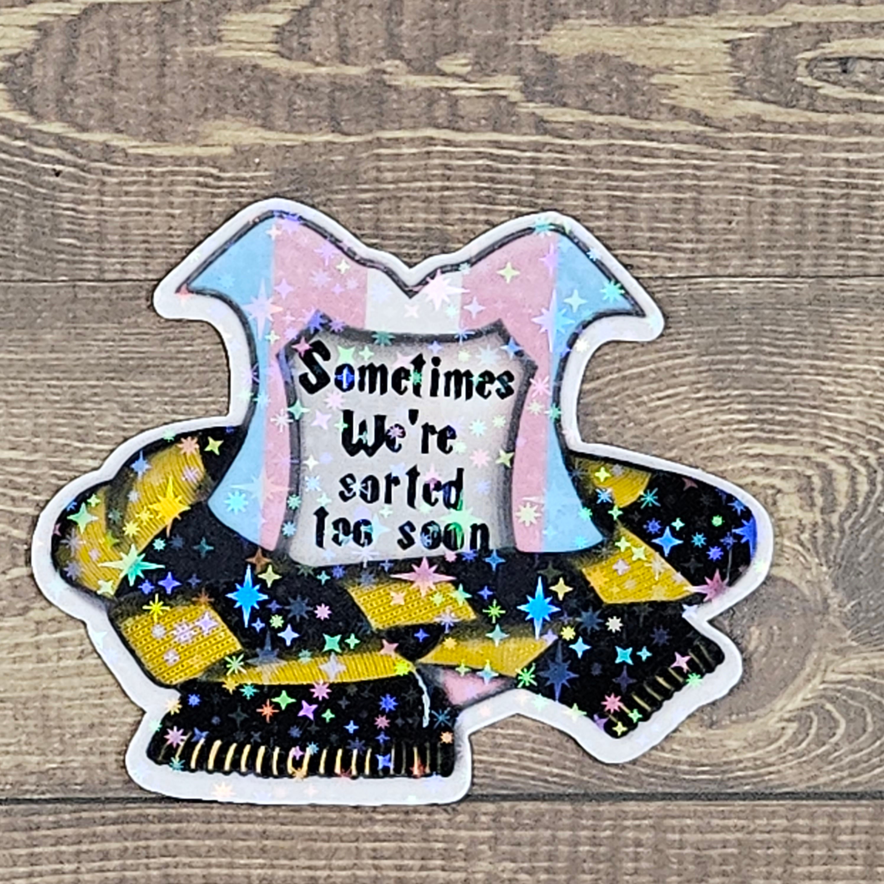 A pride sticker with your choice of scarf! Featuring the Trans Pride flag taking over the Hogwarts Crest.