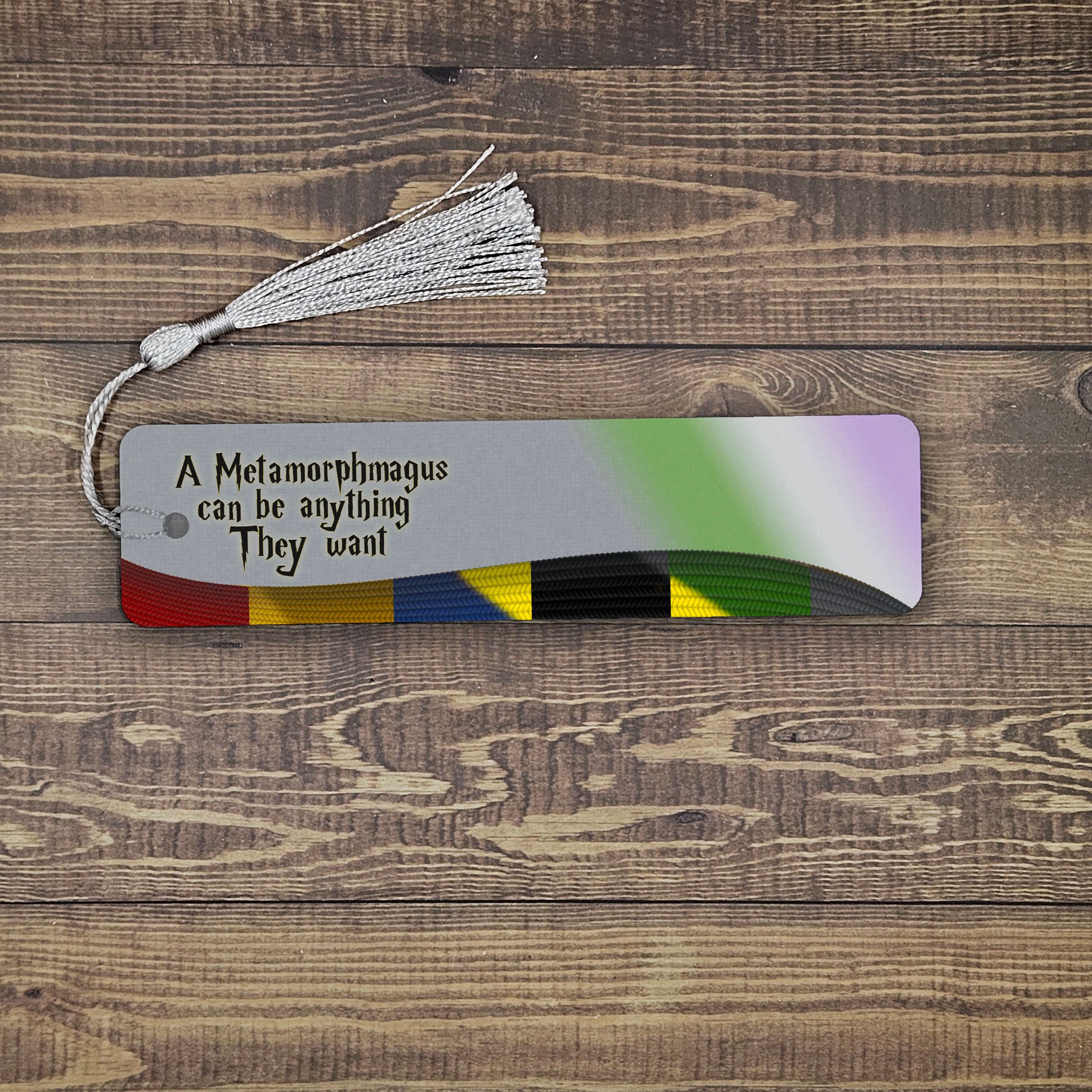 Take back the Fandom! This nod to the ever-changing wizards features all the houses, and a light effect of the Genderqueer pride flag.