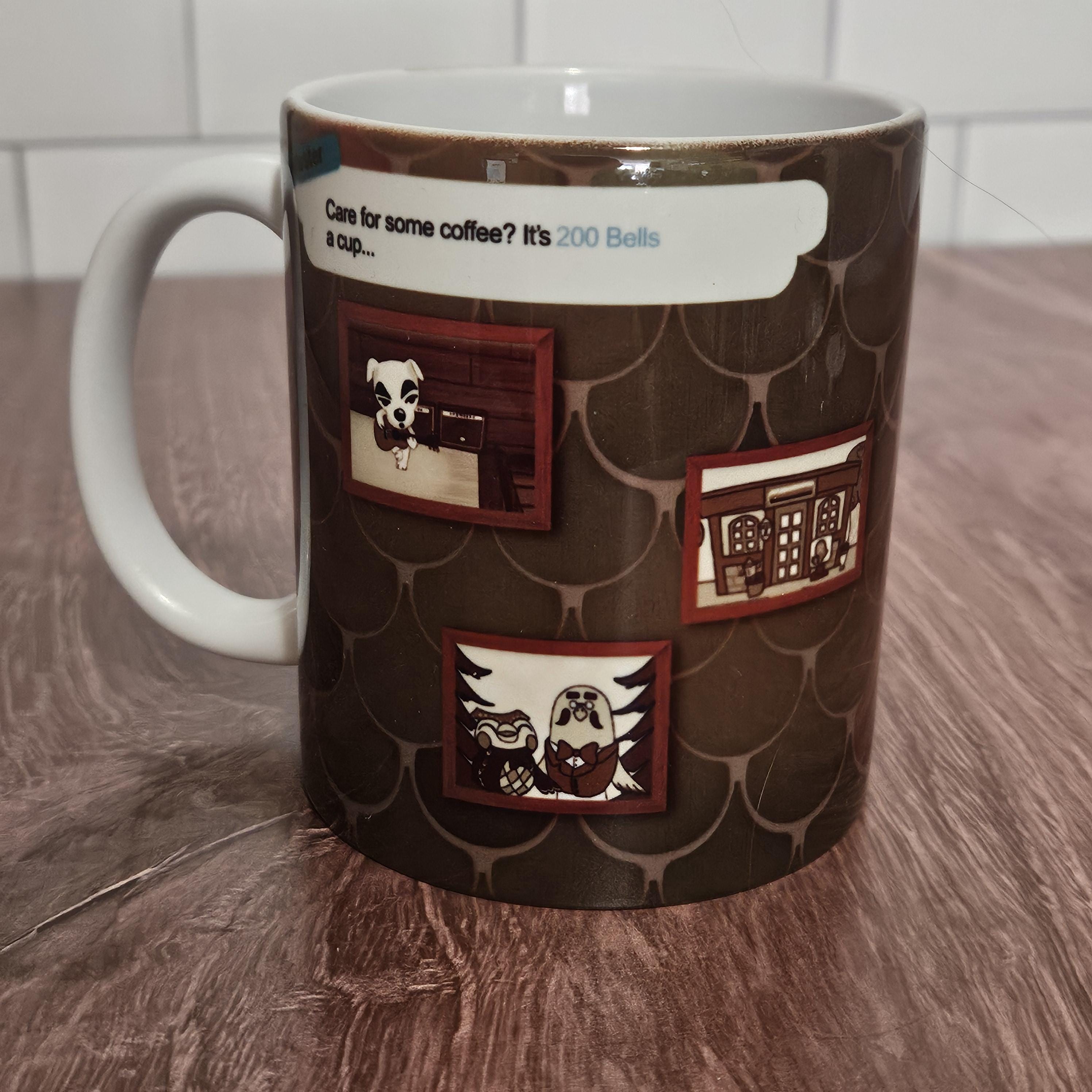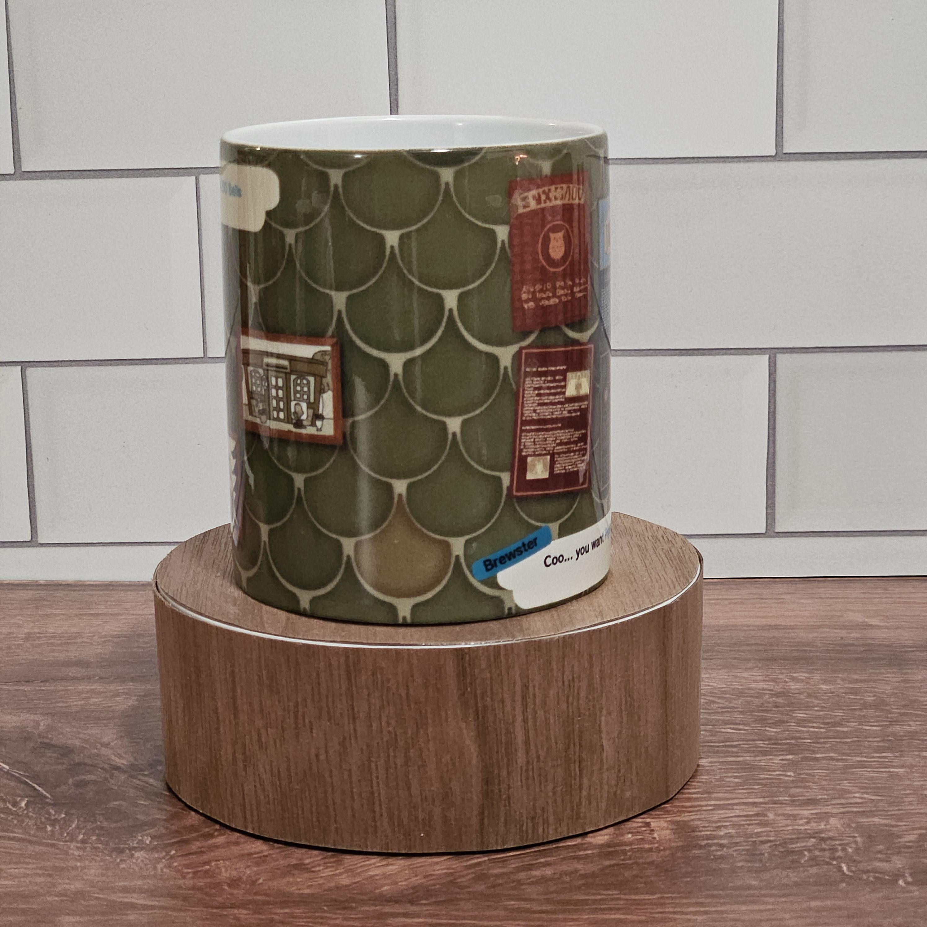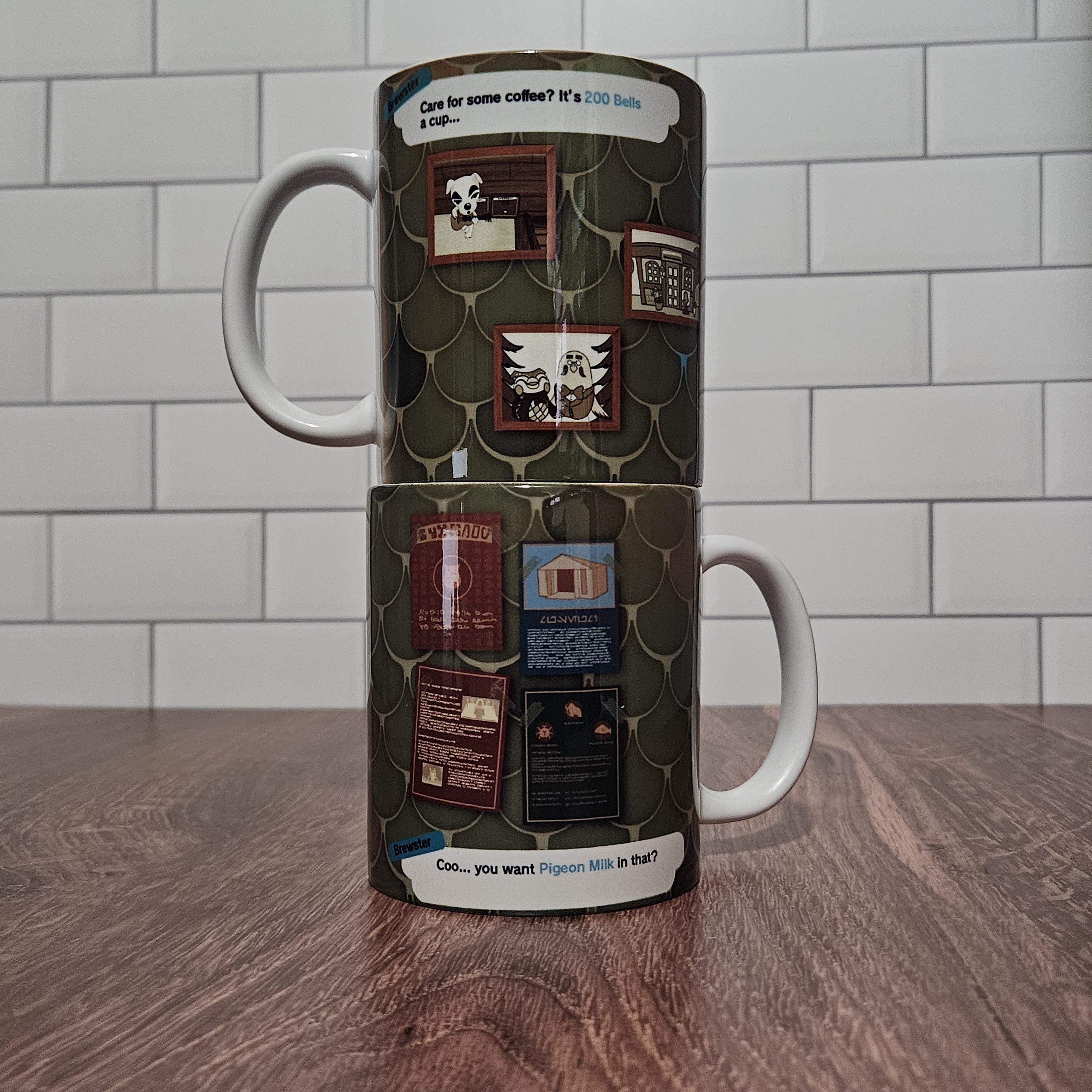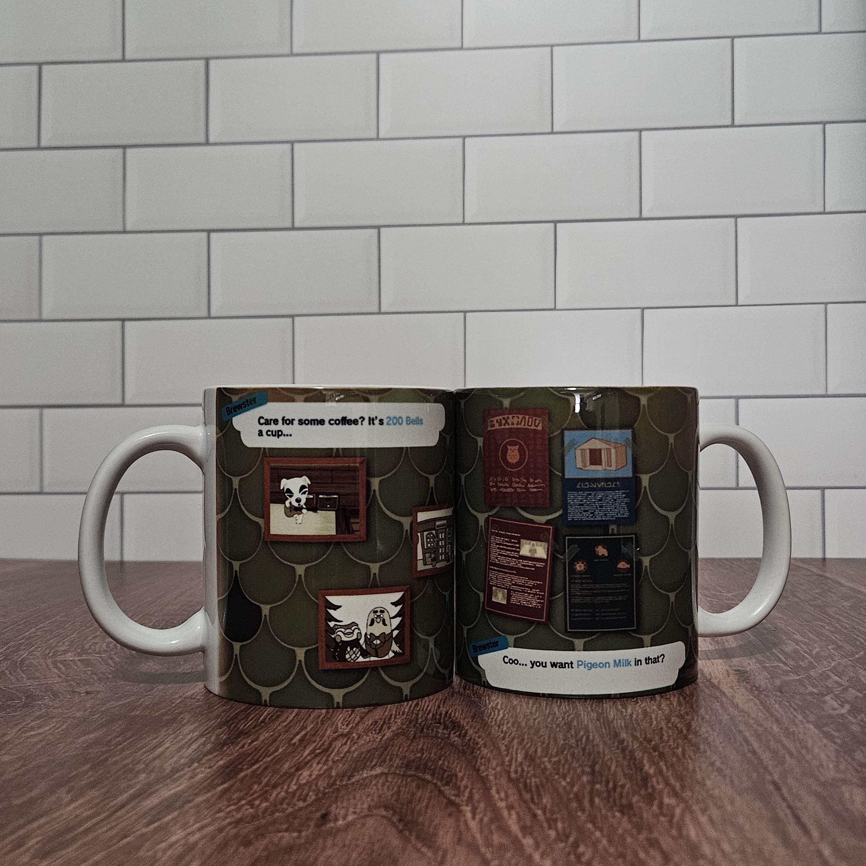 Themed after the Animal Crossing New Horizons Roost Cafe, this mug emulates the walls of the cafe. One side featuring replicas of the photos found at the entrance, and Brewster's customary greeting when you sit. The other side has replicas of the posters by the amiibo phone, and the awkward question this creator has yet to say no to (who wants to hurt his feelings? I don't.)