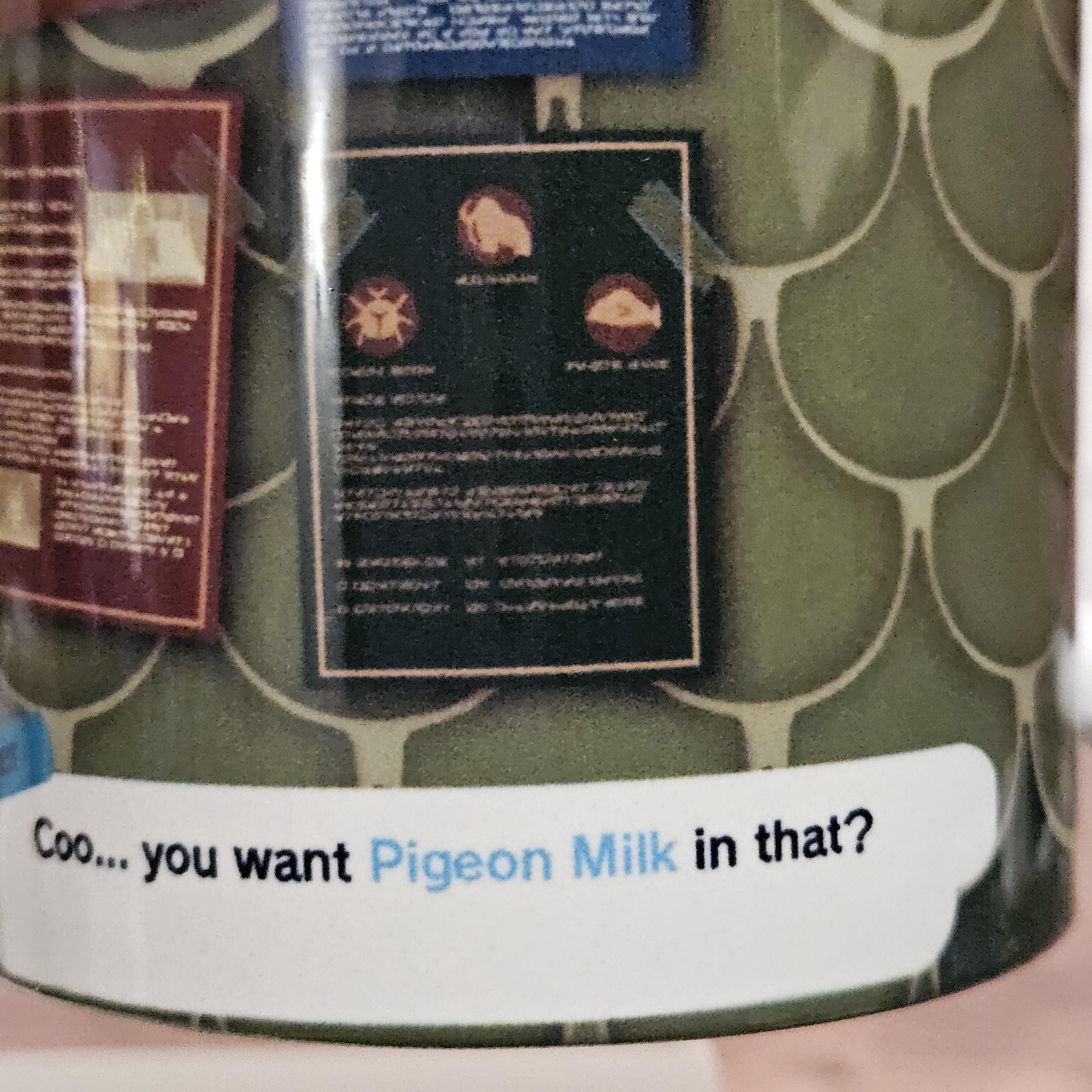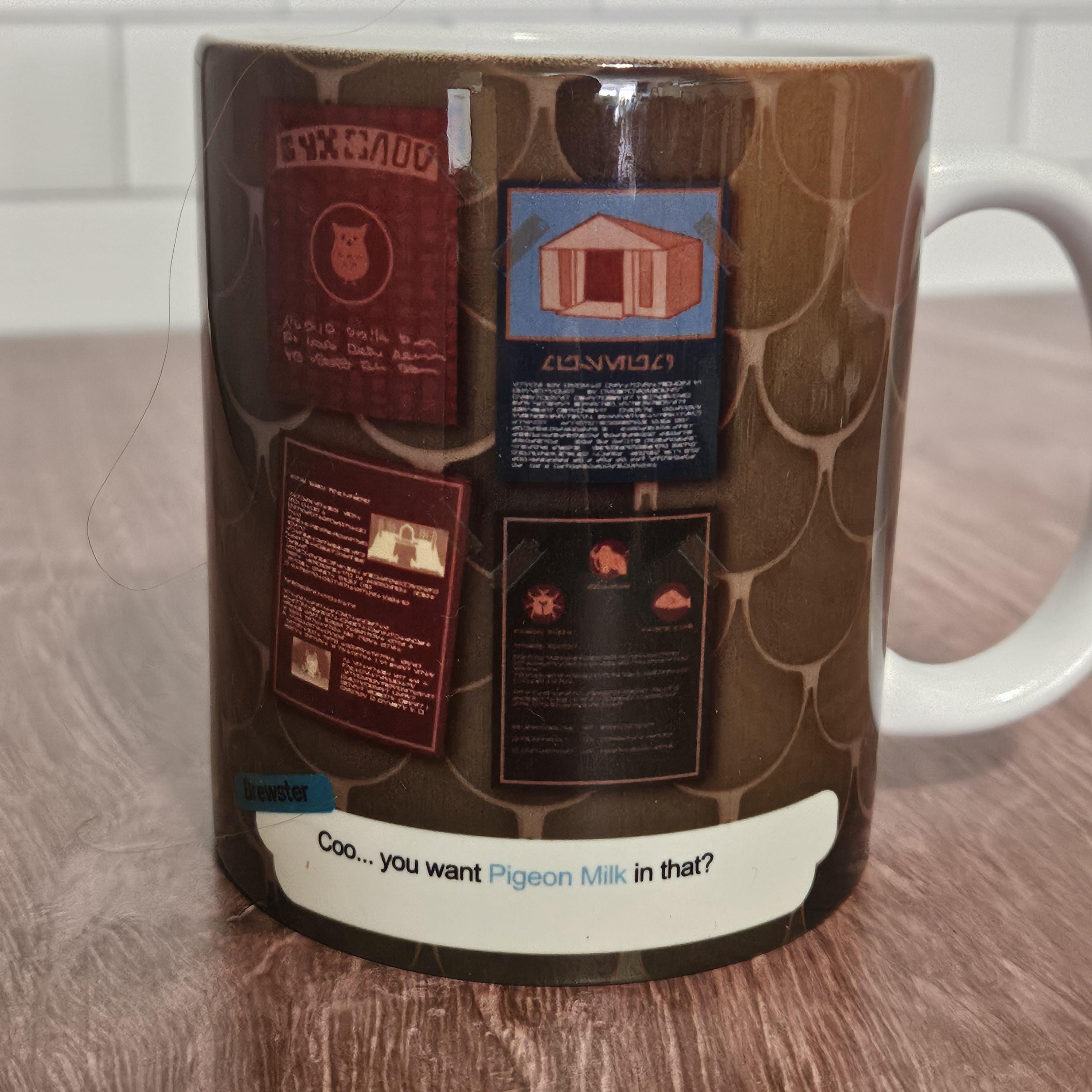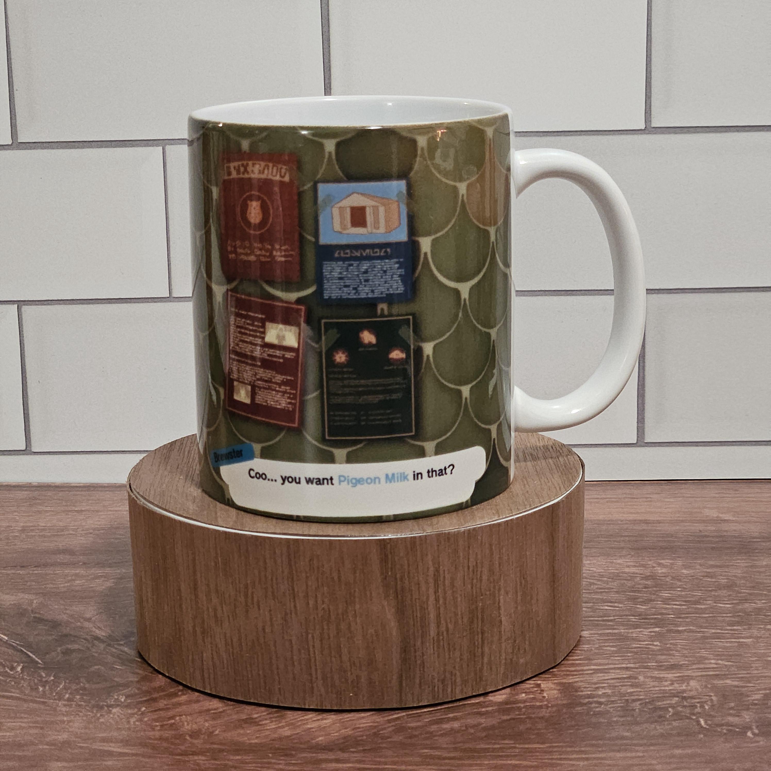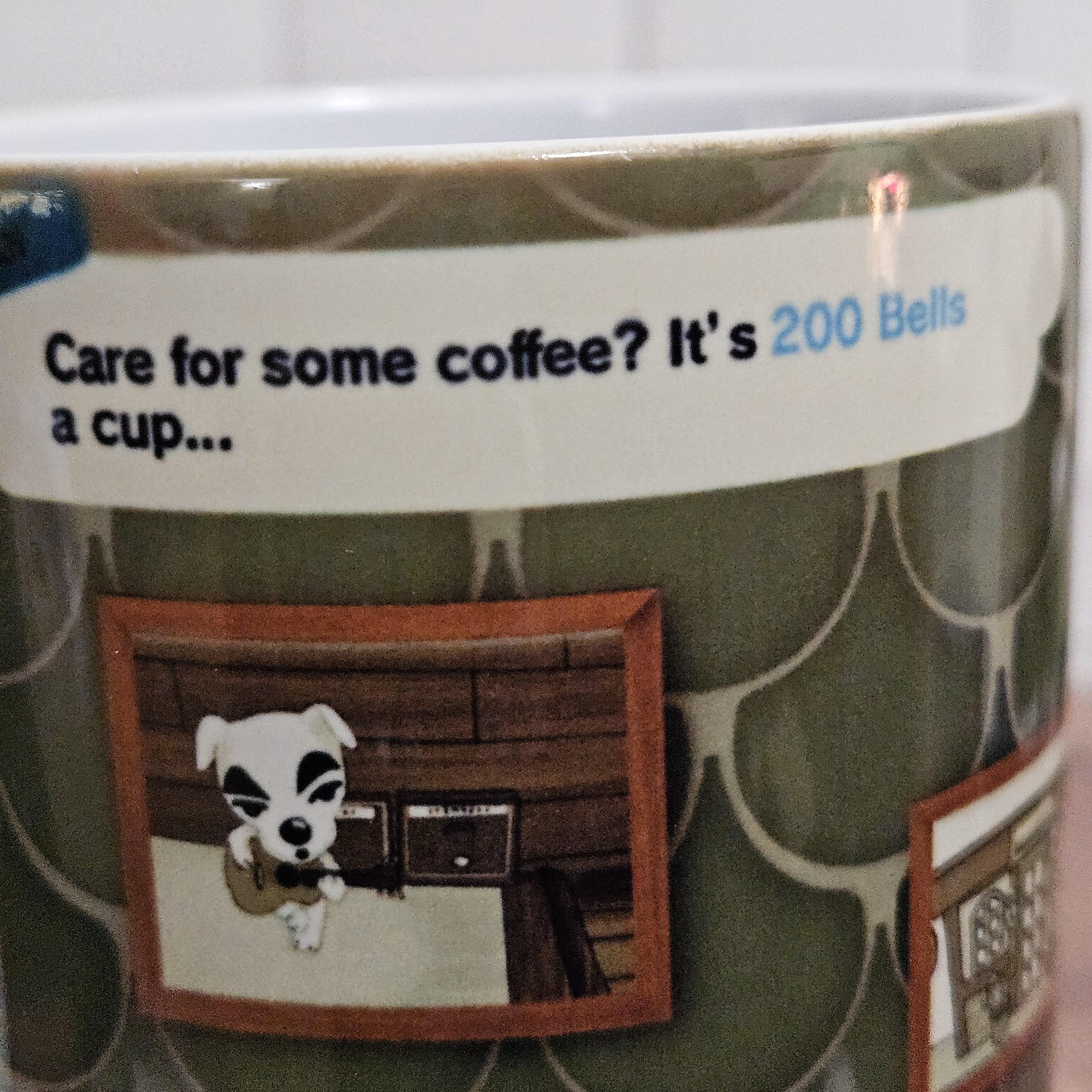 Themed after the Animal Crossing New Horizons Roost Cafe, this mug emulates the walls of the cafe. One side featuring replicas of the photos found at the entrance, and Brewster's customary greeting when you sit. The other side has replicas of the posters by the amiibo phone, and the awkward question this creator has yet to say no to (who wants to hurt his feelings? I don't.)