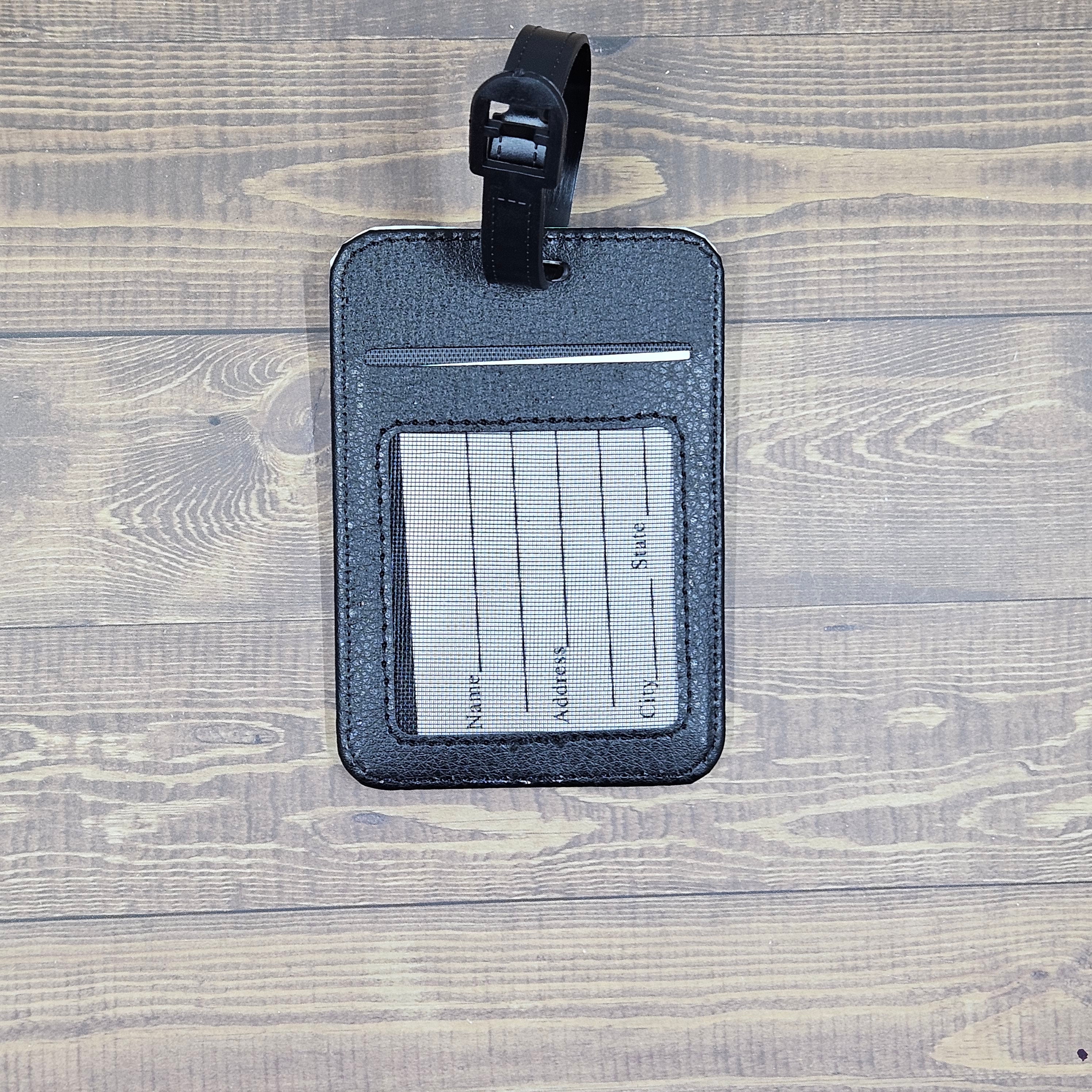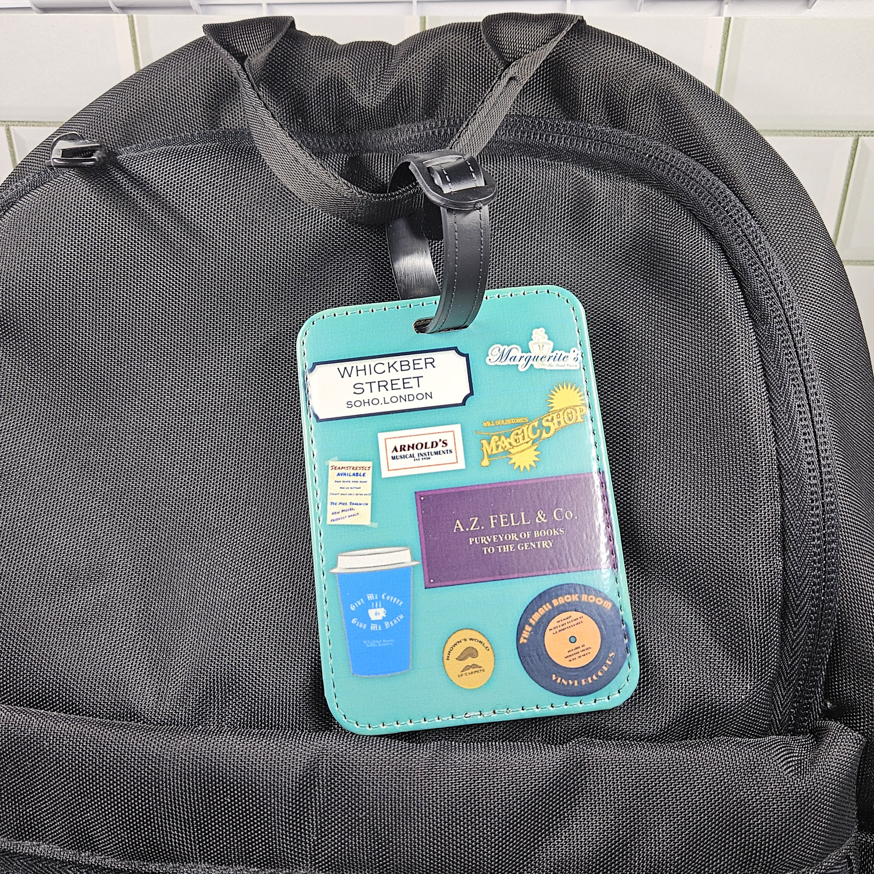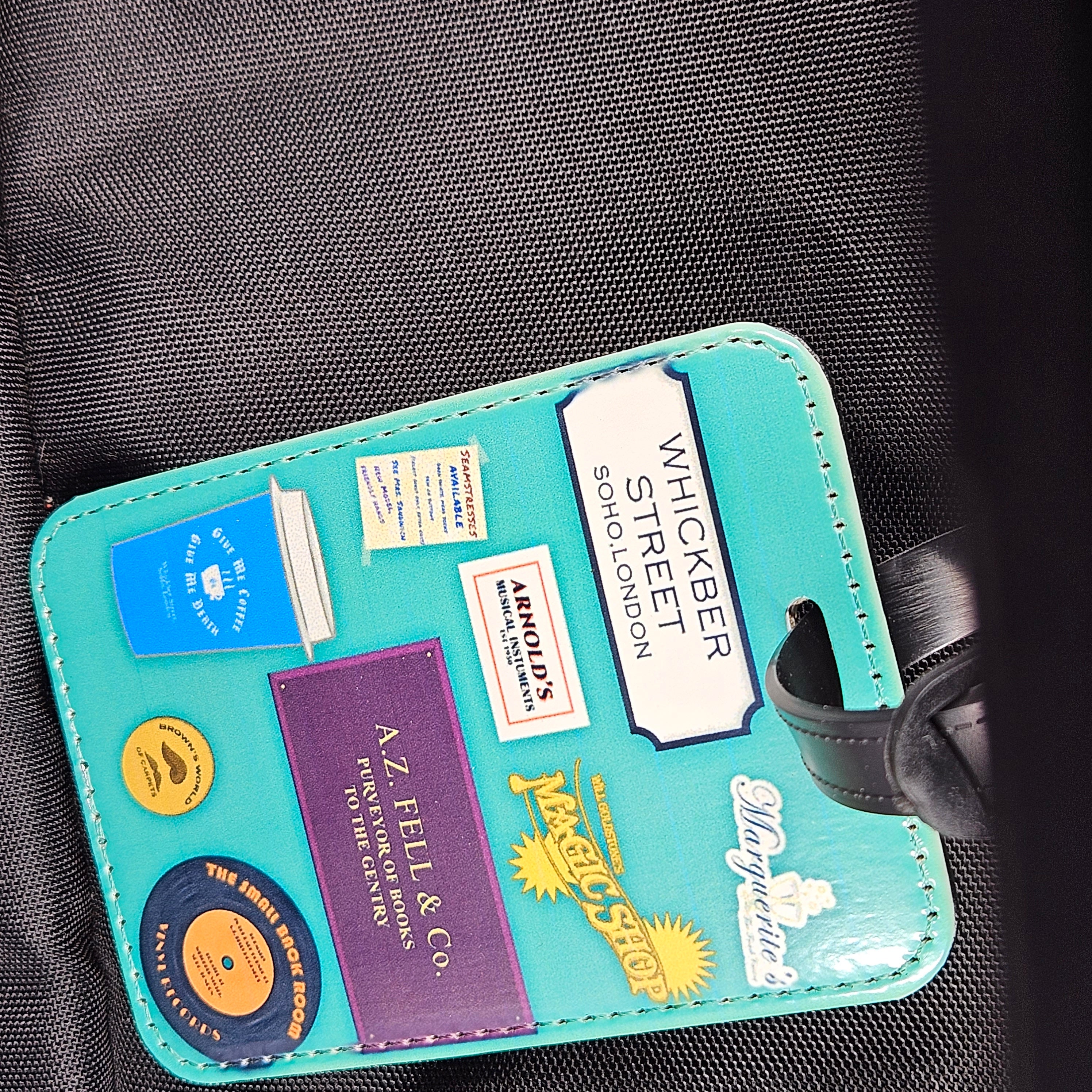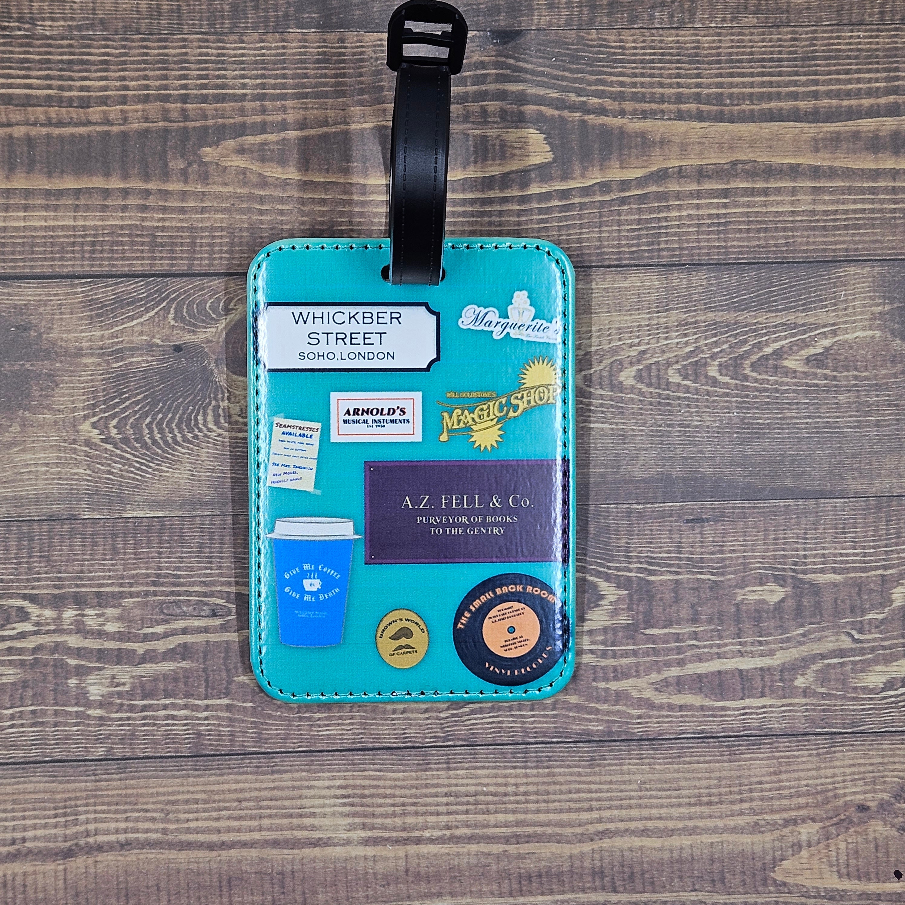 A unique way to find your luggage! This Good Omens-inspired luggage tag features shops on the fictional Whickber Street where the bookshop resides. Roughly 3x4 inches, this tag is printed pleather with a removable info tag.