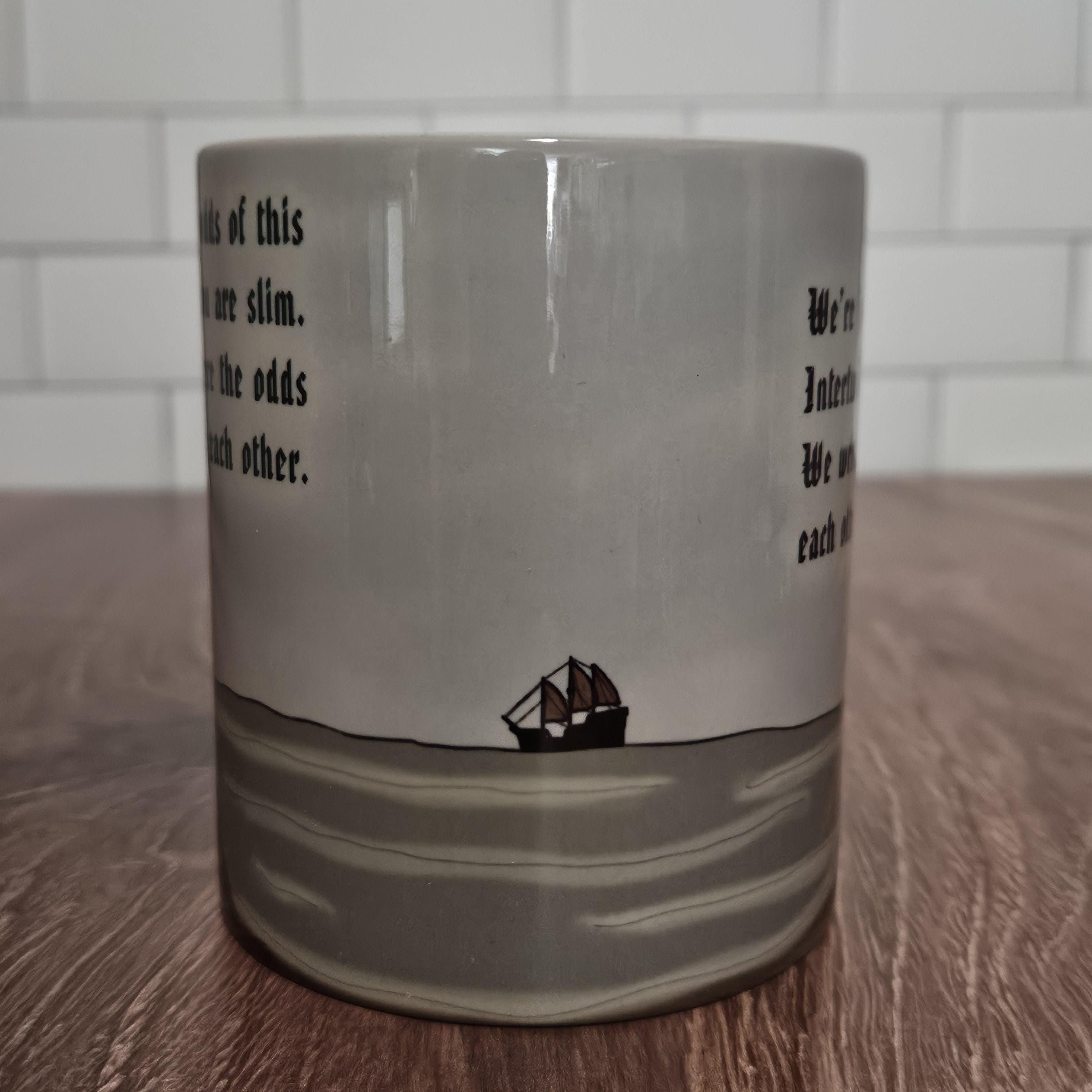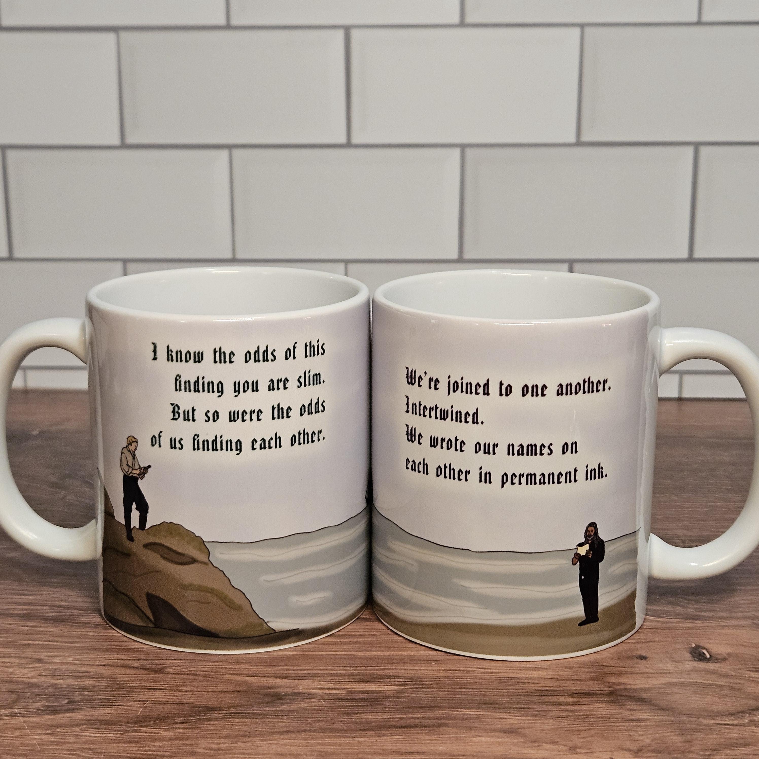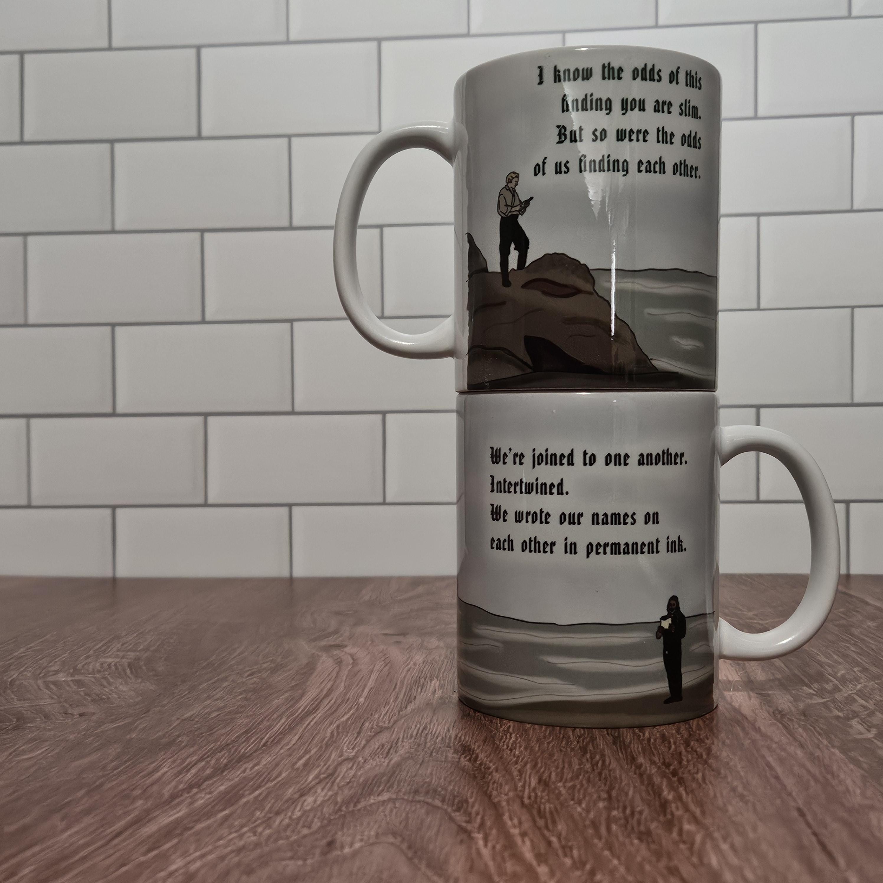11 oz, dishwasher and microwave safe mug depicting Stede sending off his letter and Ed reading one on the beach, featuring snippets of those letters heard in the show.