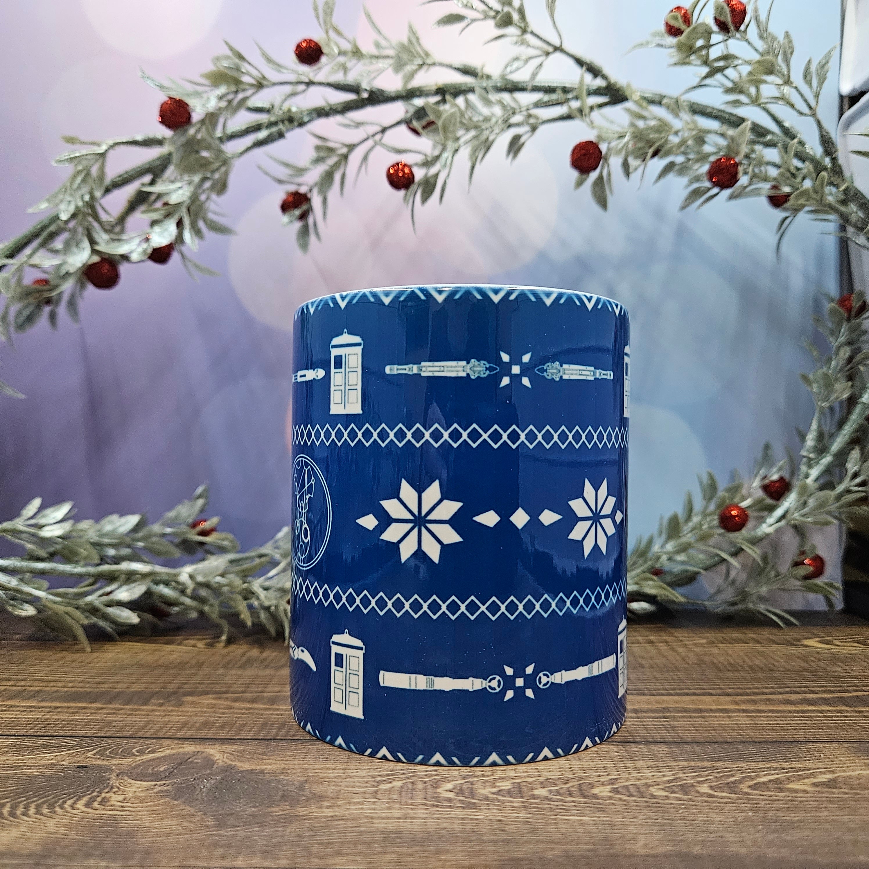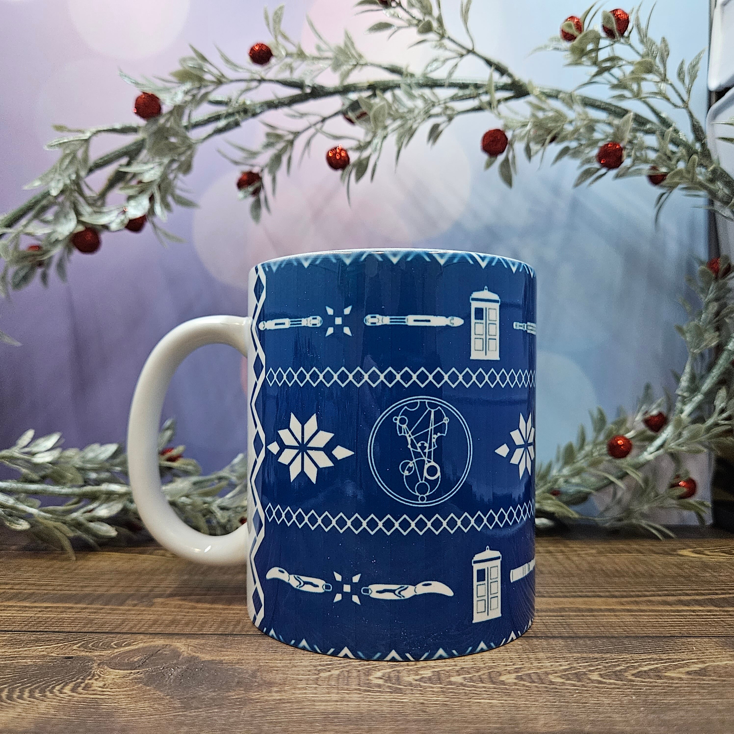 11oz Dishwasher and Microwave safe holiday mug featuring an Ugly Sweater Pattern inspired by Doctor Who.