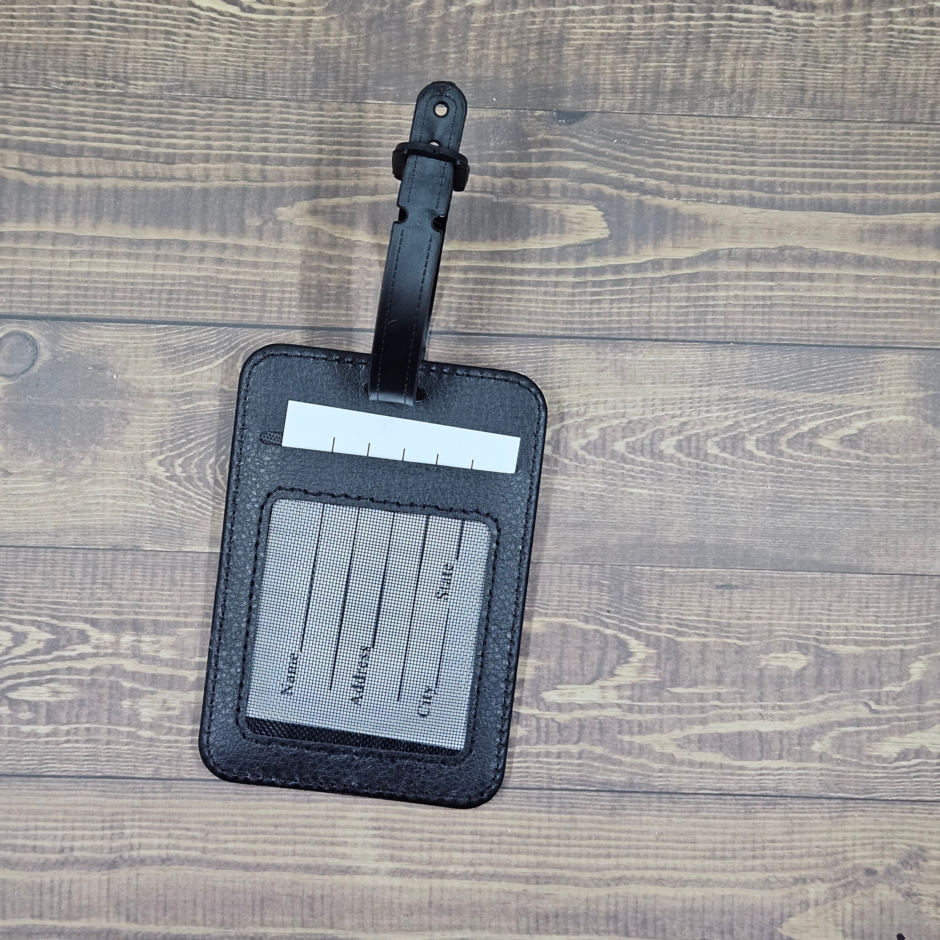 Roughly 3x4 inches, this tag is printed pleather with a removable info tag.