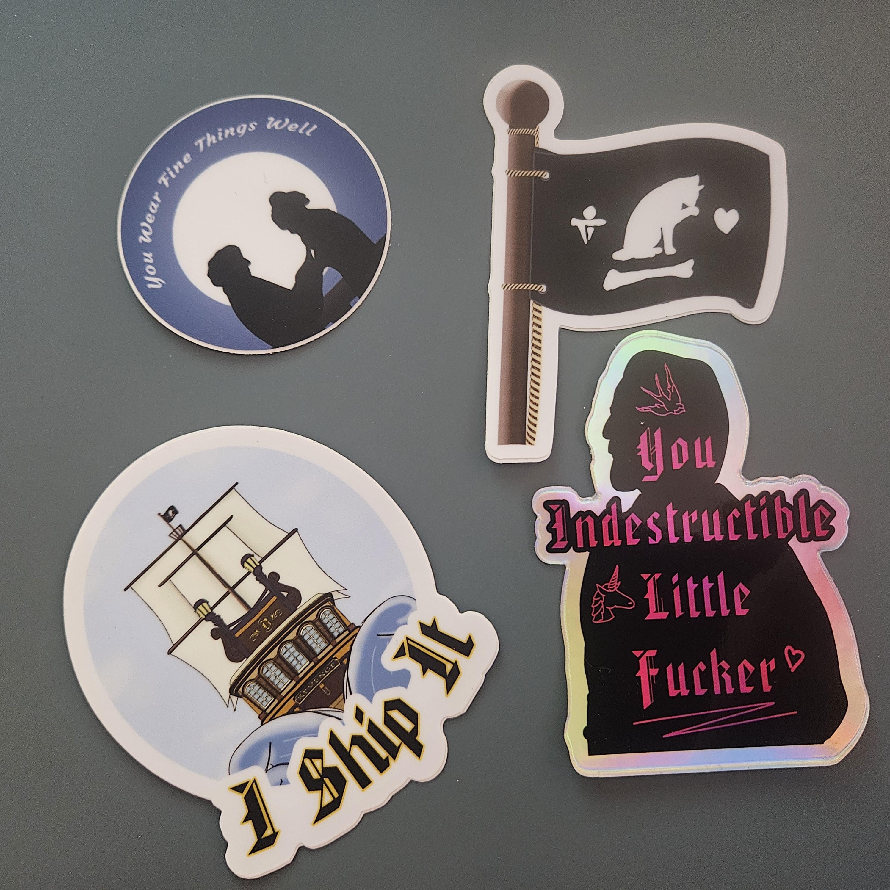 A set of Stickers inspired by Our Flag Means Death. Featuring a moonlit scene, our Captain's flag, the Revenge, and the crew's unicorn. Available all together or individually