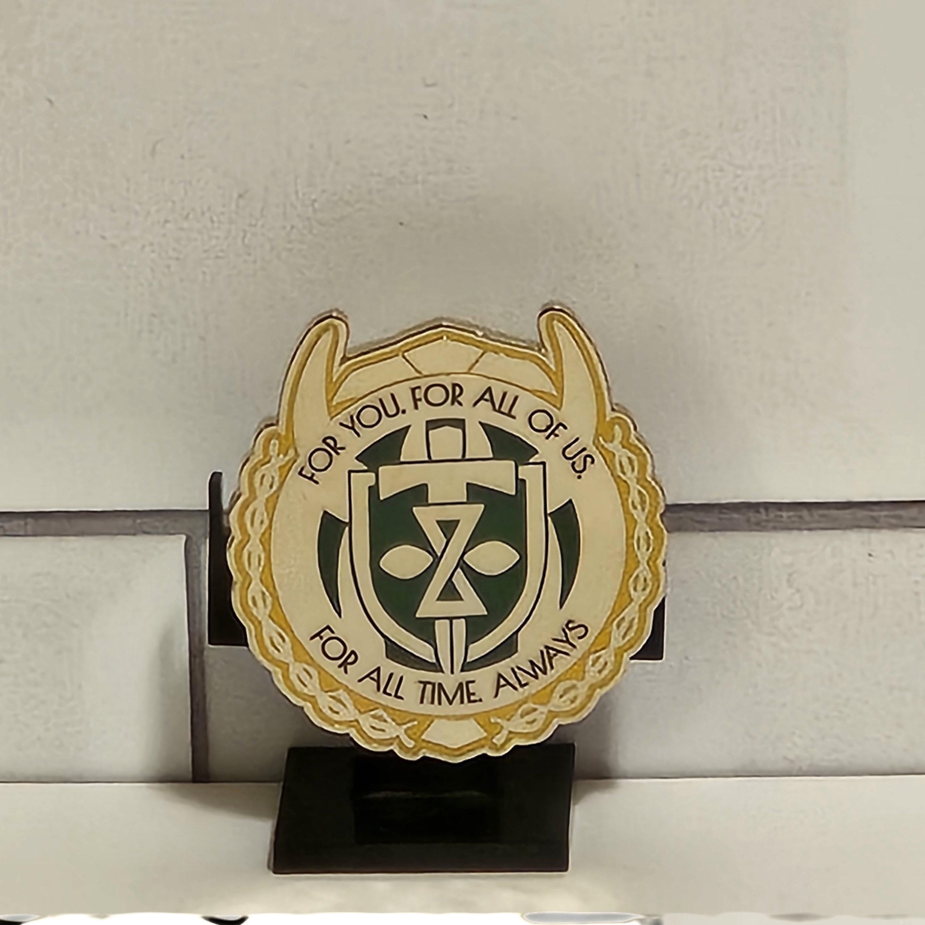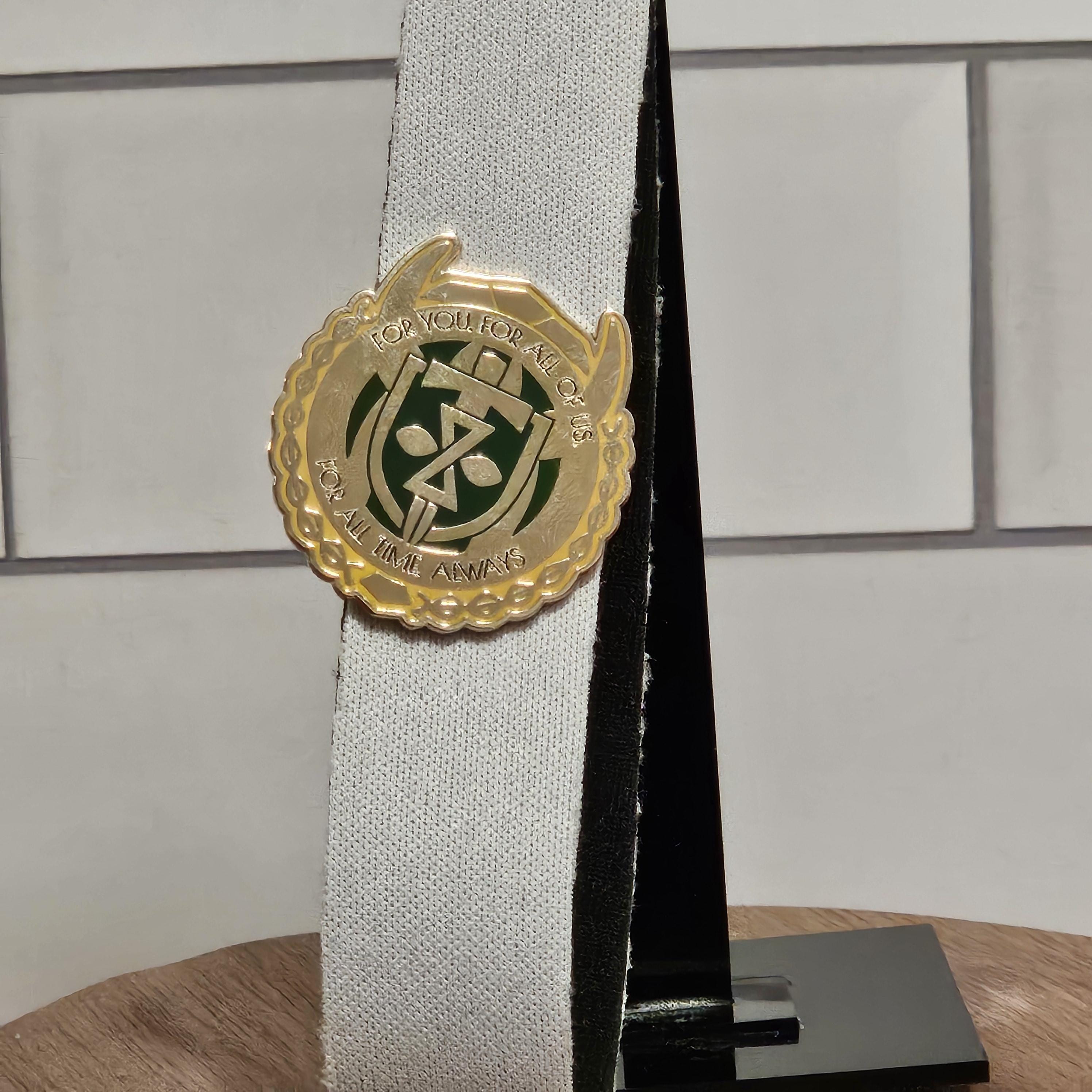 An enamel pin featuring a reimagined TVA Logo with Loki's horns. Brass with green and yellow-orange, black text has Loki's Parting words paired with the TVA motto.